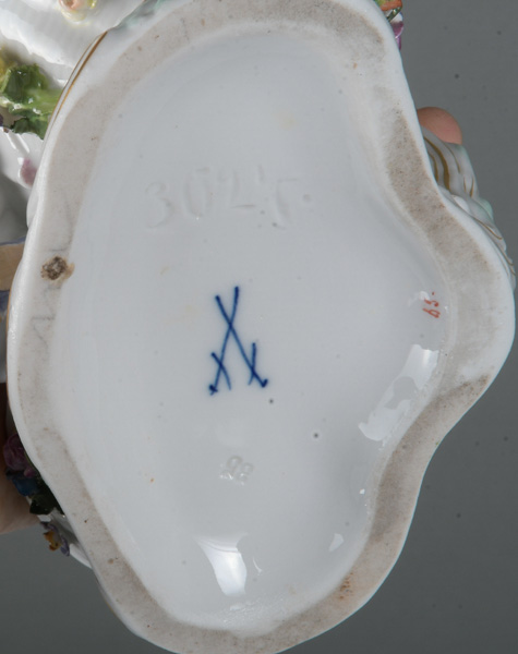 - Katalog-Nr: 1236Rokokopaar. Meissen 19. Jh. Je stehend auf rundem Rocaillesockel, gold gesäumt. Porzellan, bunt bemalt, teilweise mit Goldspitzenbordüre; am Boden unterglasurblaue Schwertermarke mit einem Schleifstrich, Modelle von J.C. Schönheit, H=je 36 cm. (best. / rest.)o.L.