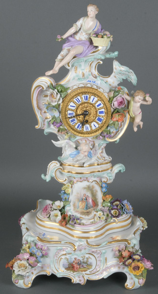 - Katalog-Nr: 1237Prunktischuhr auf Sockel. Meissen 19. Jh. Mit aufwendig aufbossierten Blüten und Blättern. Rundes Uhrwerk bekrönt von thronender Flora. Reserve bunt bemalt mit Watteauszene in Parklandschaft, gold gesäumt. Porzellan, am Boden unterglasurblaue Schwertermarke, Modell nach Johann Joachim Kaendler, H=52 cm. (Funktion geprüft / min. best.)o.L.