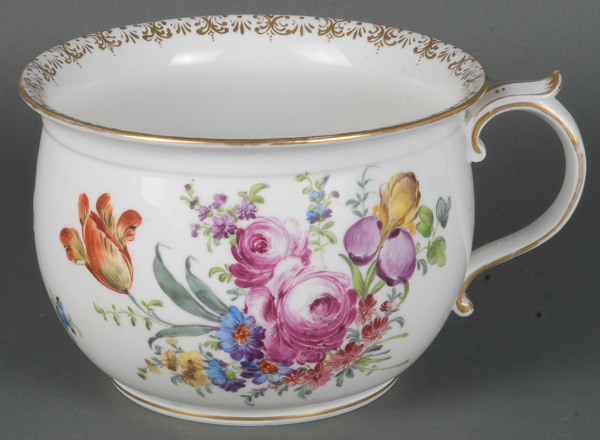 - Katalog-Nr: 1238Nachttopf. Meissen 19. Jh. Porzellan, bunt bemalt mit Blumenbouquet, umgeben von Streublumen, breite Goldspitzenbordüre; am Boden unterglasurblaue Schwertermarke mit zwei Schleifstrichen, H=13,2 cm, D=18,8 cm.o.L.