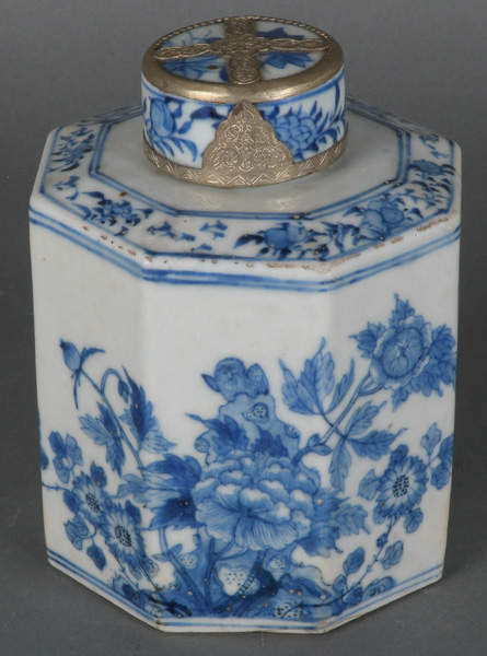 - Katalog-Nr: 1243Oktogonale Teedose. China. Porzellan, unterglasurblau bemalt mit Floraldekor; am Boden gemarkt, H=16 cm.o.L.