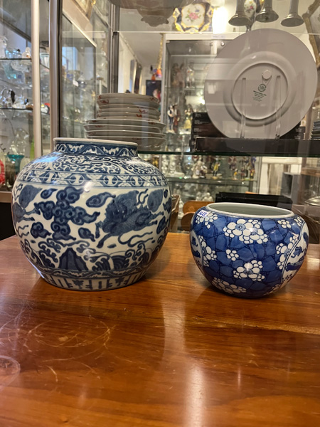 - Katalog-Nr: 1261Zwölftlgs. Konvolut Asiatika. Porzellan, unterglasurblau bemalt bzw. mit Craqueléglasur; teilw. am Boden gemarkt. Bestehend aus: Ein Flakon (H=6,5 cm), eine Doppelhenkelvase (H=27 cm), zwei Deckelgefäße (H=10,5 cm), zwei Kannen (H=10 / 16 cm) und sechs Vasen (H=10 bis 23,5 cm).o.L.