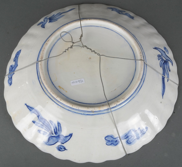 - Katalog-Nr: 1254Große runde Fächerplatte. Asien. Porzellan, unterglasurblau bemalt mit Pflanzen und Paradiesvogel; ohne Marke, D=36 cm.o.L.