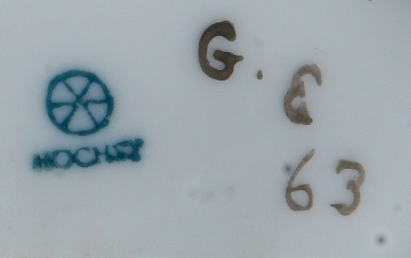 - Katalog-Nr: 1268Kanne „Tischchenmuster“. Meissen 19. Jh. Porzellan, bunt bemalt; am Boden unterglasurblaue Schwertermarke mit zwei Schleifstrichen, H=22,5 cm. (min. best.)o.L.