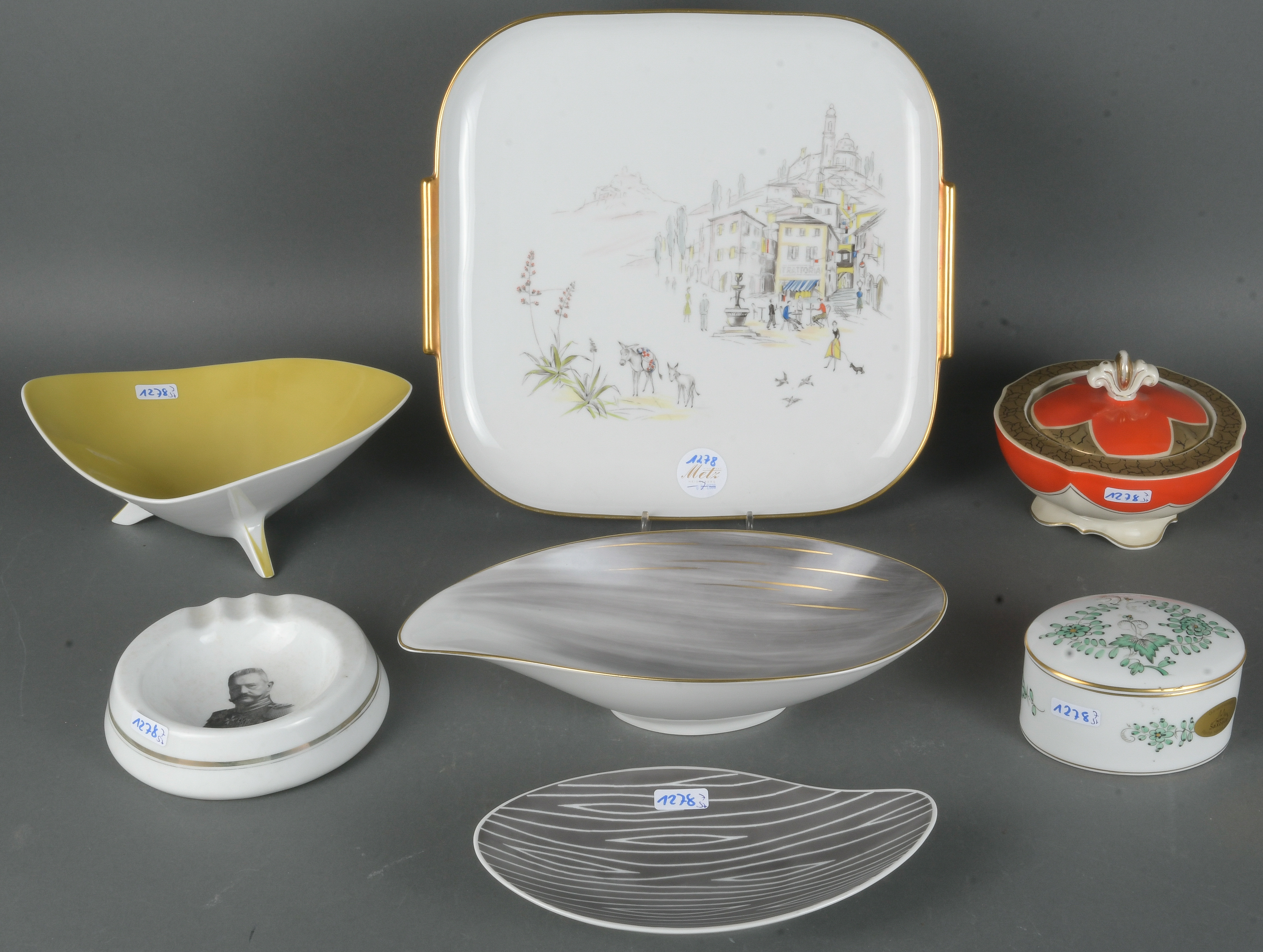 - Katalog-Nr: 1278Siebentlgs. Konvolut. Hutschenreuther / Rosenthal / Tillowitz / Tirschenreuth 20. Jh. Porzellan, bunt bemalt bzw. dekoriert; am Boden gemarkt. Bestehend aus: Ein Tablett (H=5 cm, B=30 cm, T=31 cm), drei Schalen (B=21 bis 27 cm), ein Aschenbecher (D=13 cm) und zwei Deckeldosen (H=5,5 / 10,5 cm).o.L.