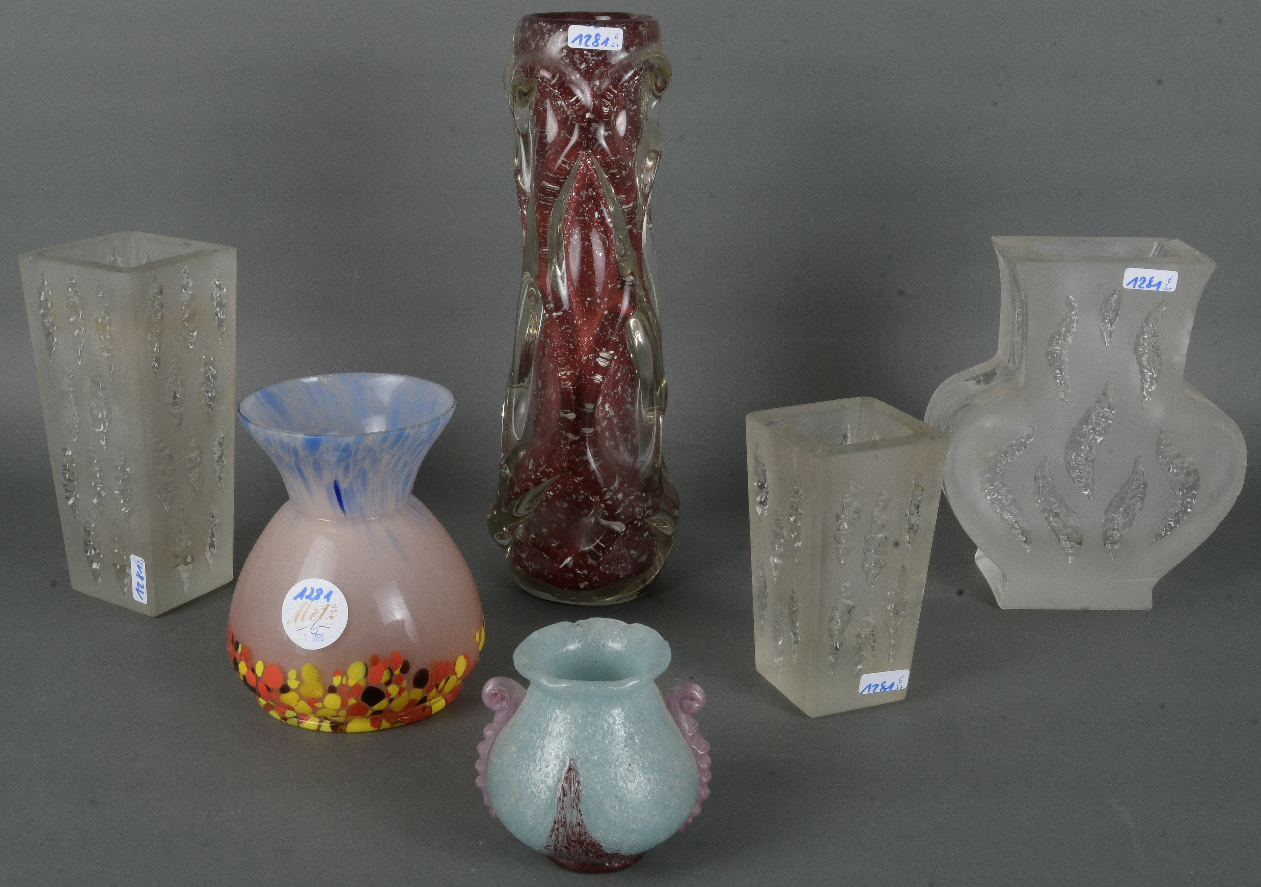 - Katalog-Nr: 1281Sechs unterschiedliche Vasen, u.a. Murano 20. Jh. Farbloses Glas, farbig überfangen, teilw. mit eingeschmolzenen Silberflocken / Aufschmelzungen bzw. blattförmig geschliffen, H=8,5 bis 29 cm.o.L.
