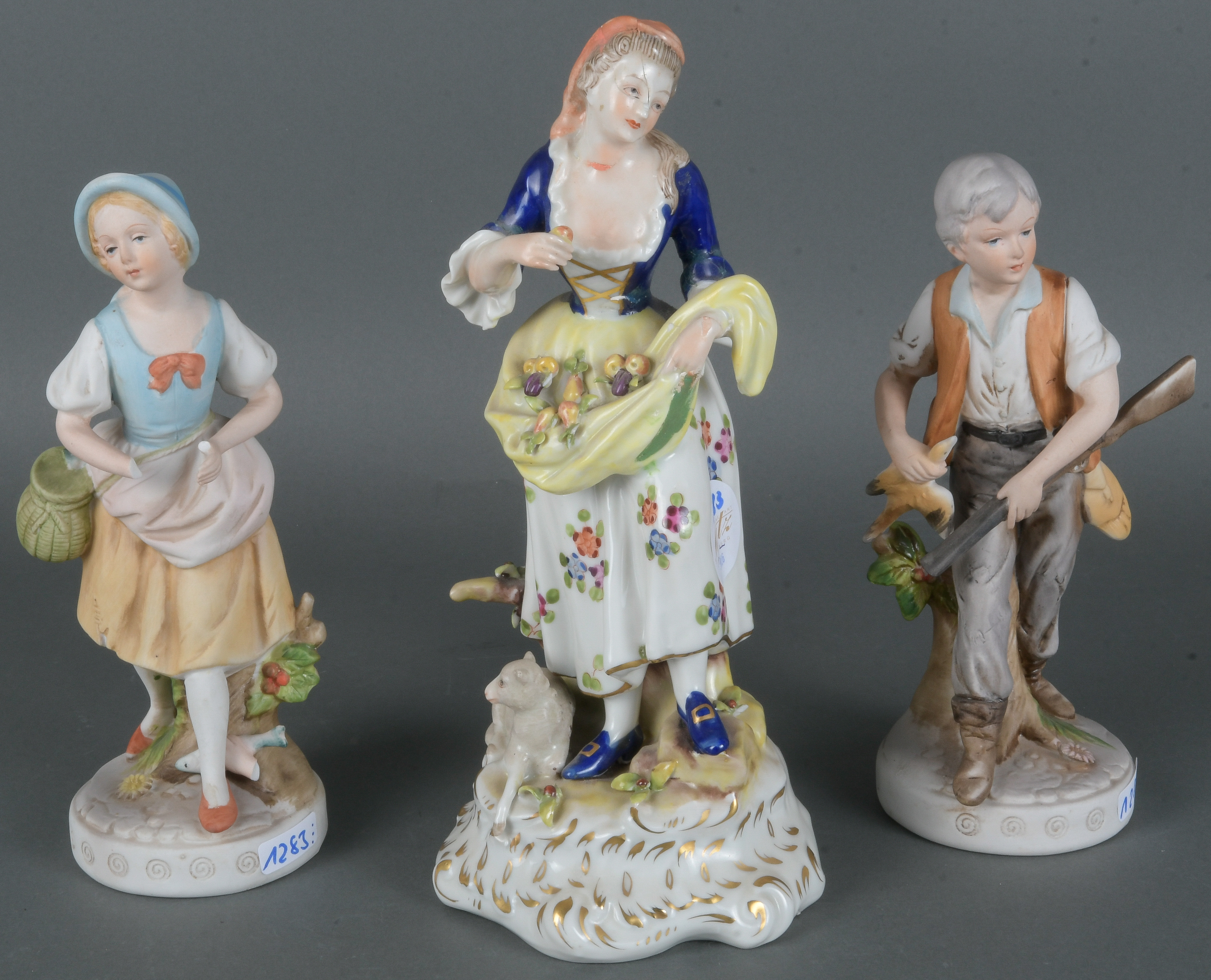 - Katalog-Nr: 1283Fischverkäuferin, Jäger und Gärtnerin. Thüringen 20. Jh. Bisquit- / Porzellan, bunt bemalt, am Boden gemarkt, H=21 bis 25 cm. (teilw. besch. / rest.)o.L.