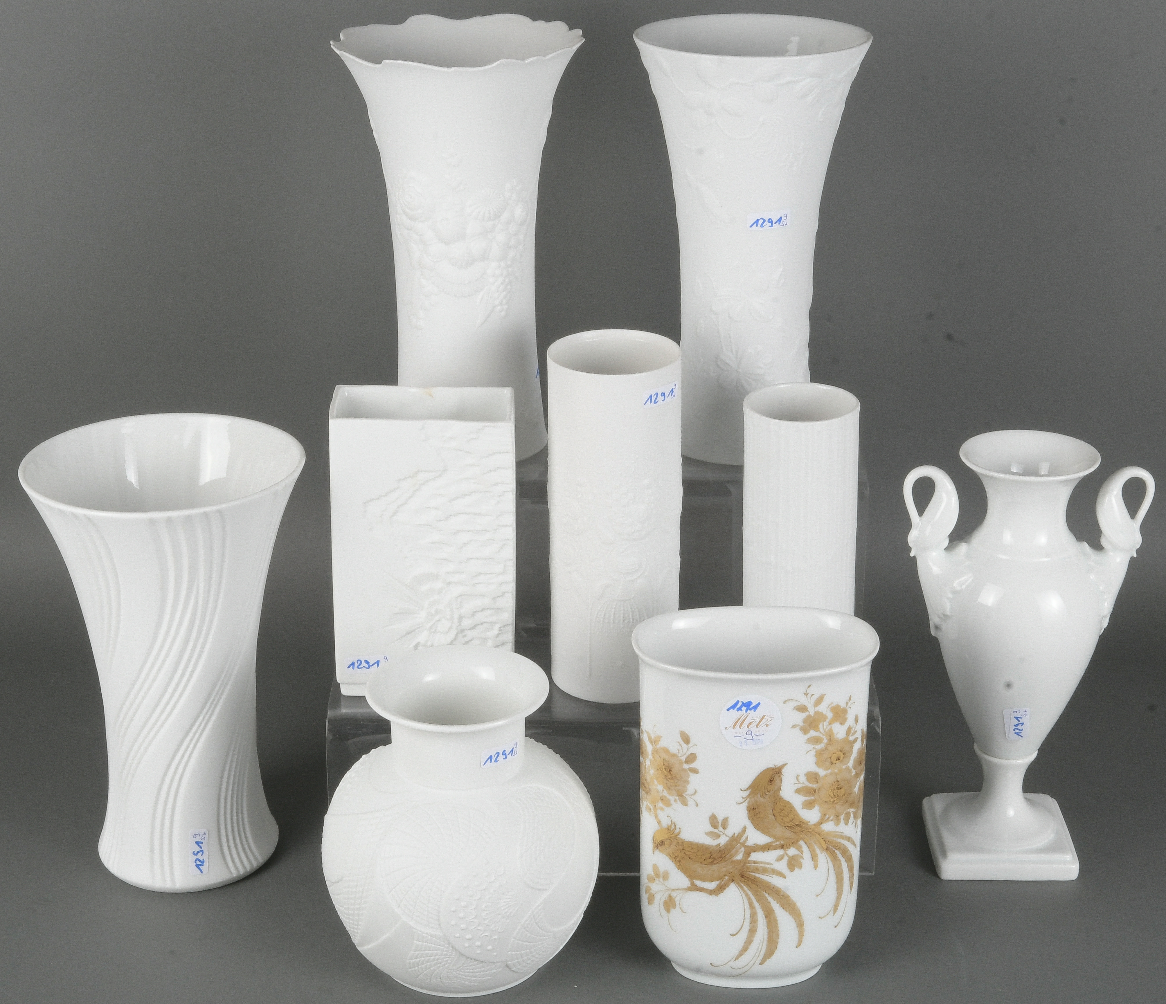 - Katalog-Nr: 1291Neun unterschiedliche Vasen. Kaiser / Rosenthal 20. Jh. Porzellan, teilw. weiß glasiert / gold bemalt, eine sign. K. Nossek; am Boden gemarkt, H=15 bis 24 cm.o.L.