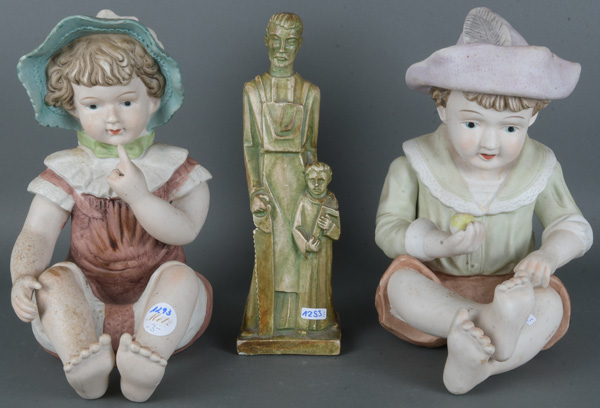- Katalog-Nr: 1293Zwei Kinderfiguren, je sitzend. Deutsch 20. Jh. Porzellan, bunt gefärbt; ohne Marke (H=31,5 / 32 cm); dazu Gipsfigur des Hl. Josef (H=31 cm).o.L.