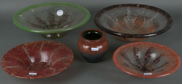 - Katalog-Nr: 1295Vier Schalen. WMF Ikora 20. Jh. Farbloses Glas, teilw. farbig überfangen, mit Craquelédekor; dazu Vase der Verreries Siprex, H=6,5 bis 9 cm, D=23,5 bis 34 cm.o.L.
