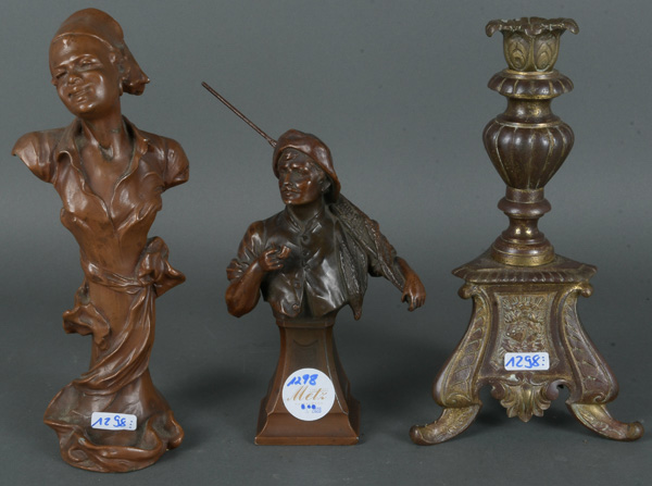 - Katalog-Nr: 1298Bildgießer des 20. Jhs. Fahnenträger und Büste, je Bronze; dazu ein Kerzenständer, Metall, bronziert, H=19,5 bis 25 cm.o.L.
