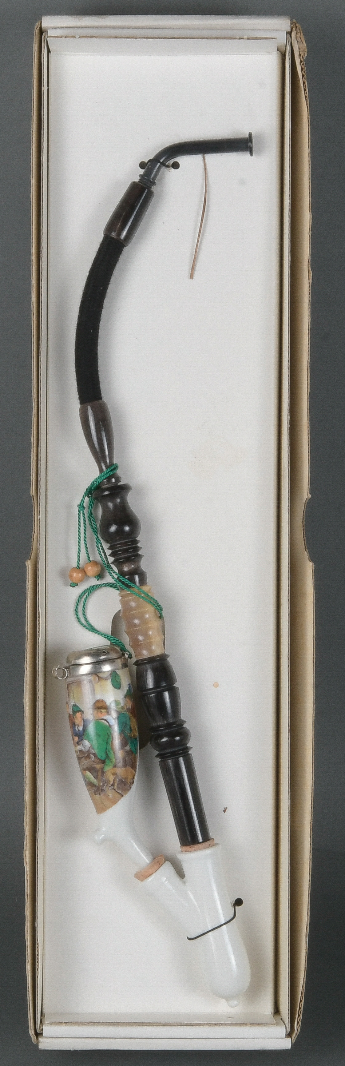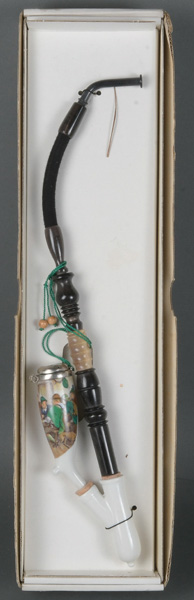 - Katalog-Nr: 1303Gesteckpfeife. Deutsch 19. Jh. Mit Porzellanpfeifenkopf, Holzrohr und Hornmundstück, bunt dekoriert mit Gasthausszene.o.L.