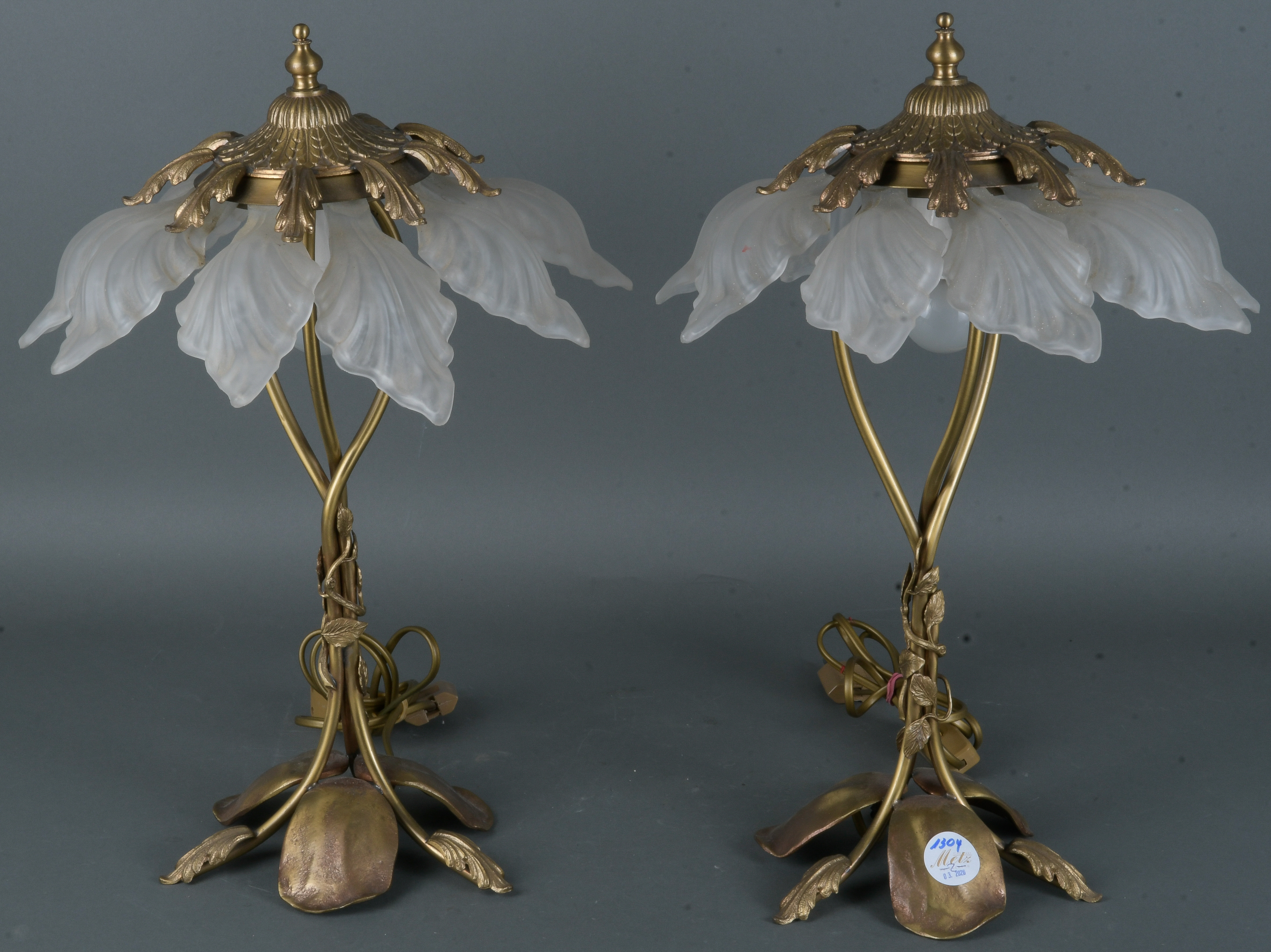 - Katalog-Nr: 1304Paar Tischlampen. Wohl deutsch 20. Jh. Metall mit Glasschirm, H=je 49 cm, D=je 33 cm. (Funktion ungeprüft)o.L.