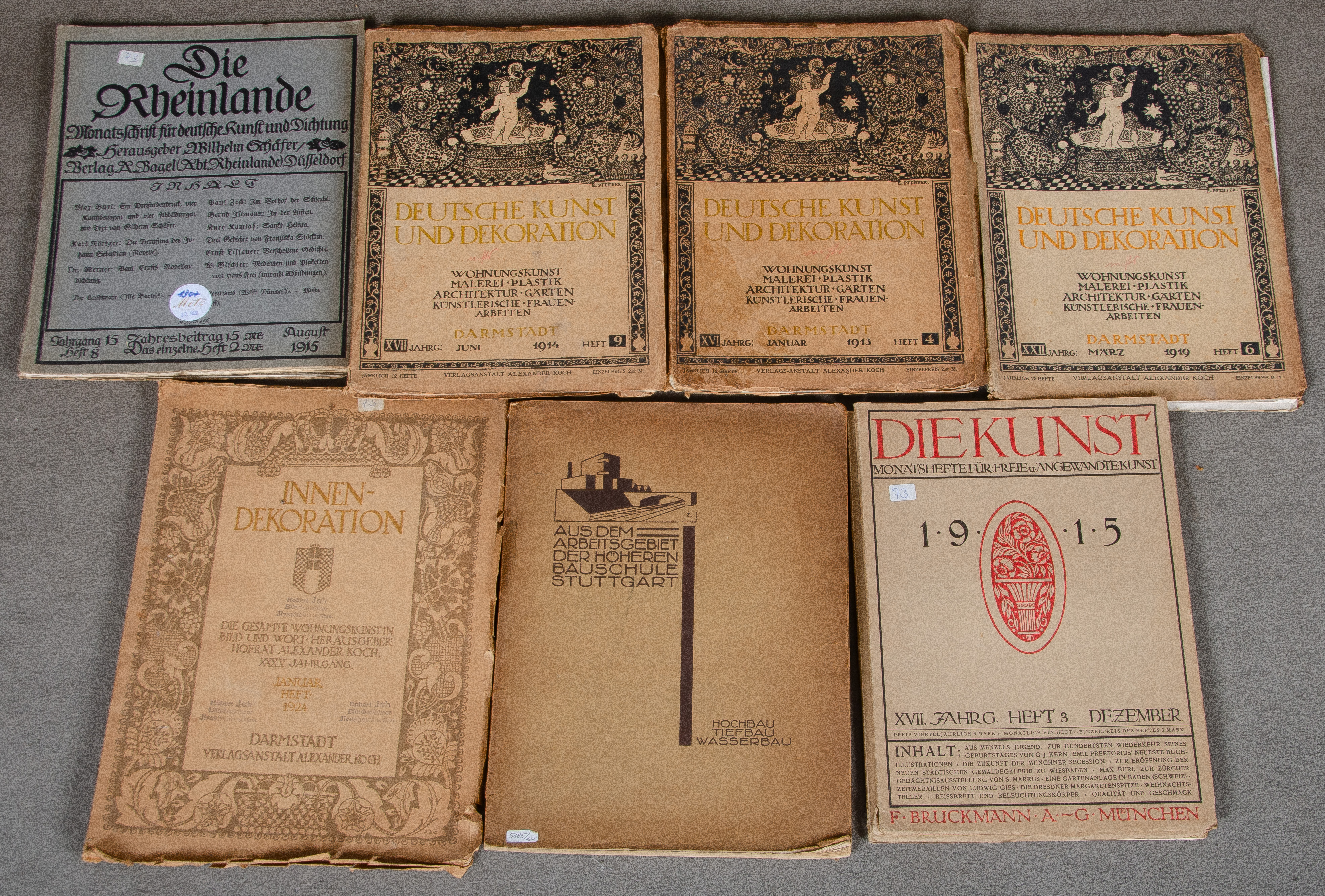 - Katalog-Nr: 1307Konvolut Kunstzeitschriften, u.a.: „Die Kunst“, Heft 2 und 3, 1915; „Die Rheinlande“, Heft 8, 1915; „Deutsche Kunst und Dekoration“, Heft 4, 1913, Heft 6 und 9, 1914, Heft 9, 1916, Heft 11, 1918; „Innendekoration“ 1924. (Gebrauchsspuren)o.L.