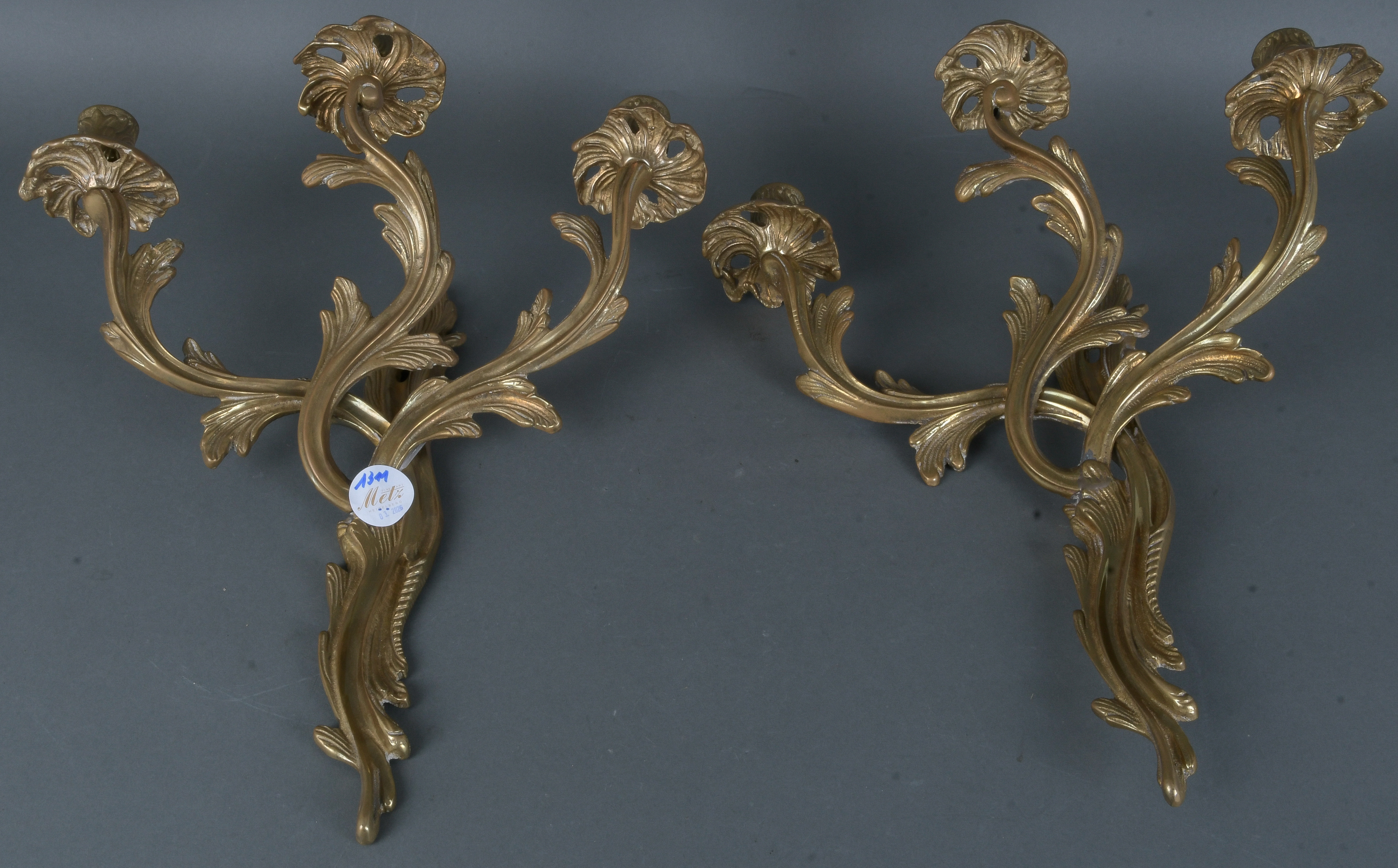 - Katalog-Nr: 1311Paar dreiflammige Wandappliken. Deutsch 20. Jh. Messing, vergoldet, reliefiert, B=je 41 cm, T=je 34 cm.o.L.
