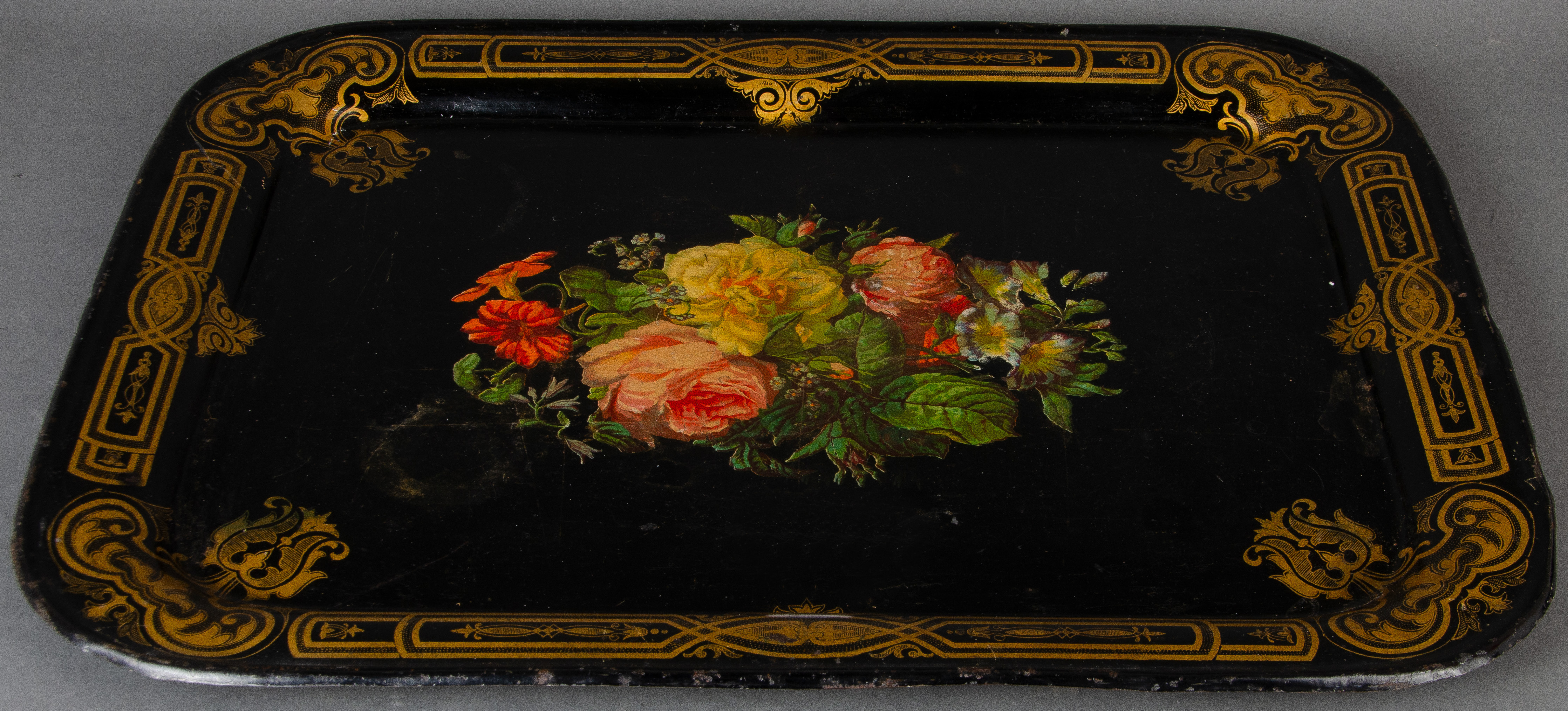 - Katalog-Nr: 1314Serviertablett. England um 1900. Blech, schwarz lackiert und bunt floral bemalt, Goldrand, H=2,5 cm, B=52 cm, T=40,5 cm.o.L.