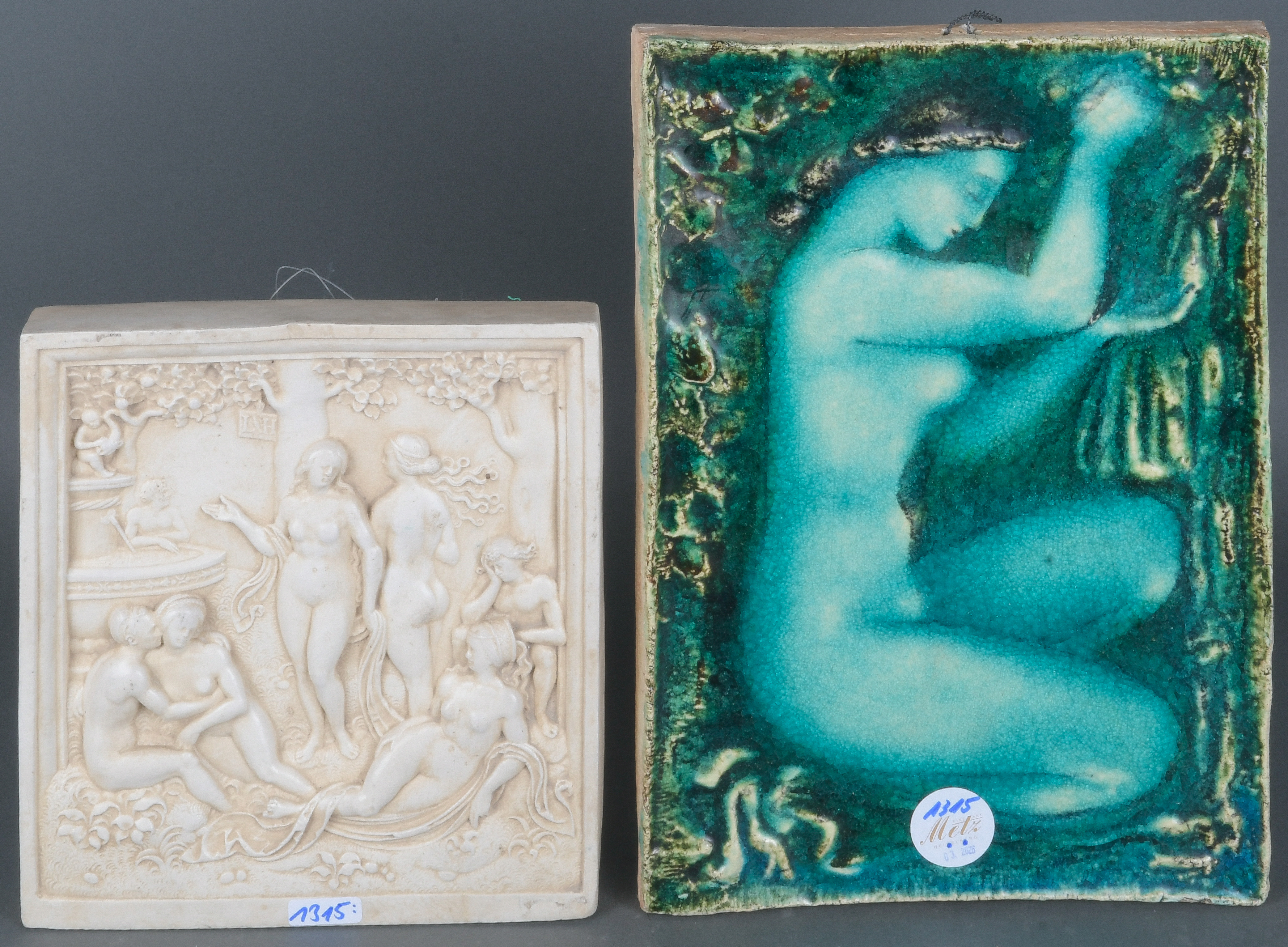- Katalog-Nr: 1315„Liebesgarten“ nach Loy Hering, Kunstguss (22,7 x 20 cm), und Wandkachel mit Mädchenakt, Keramik (32,5 x 22,5 cm).o.L.