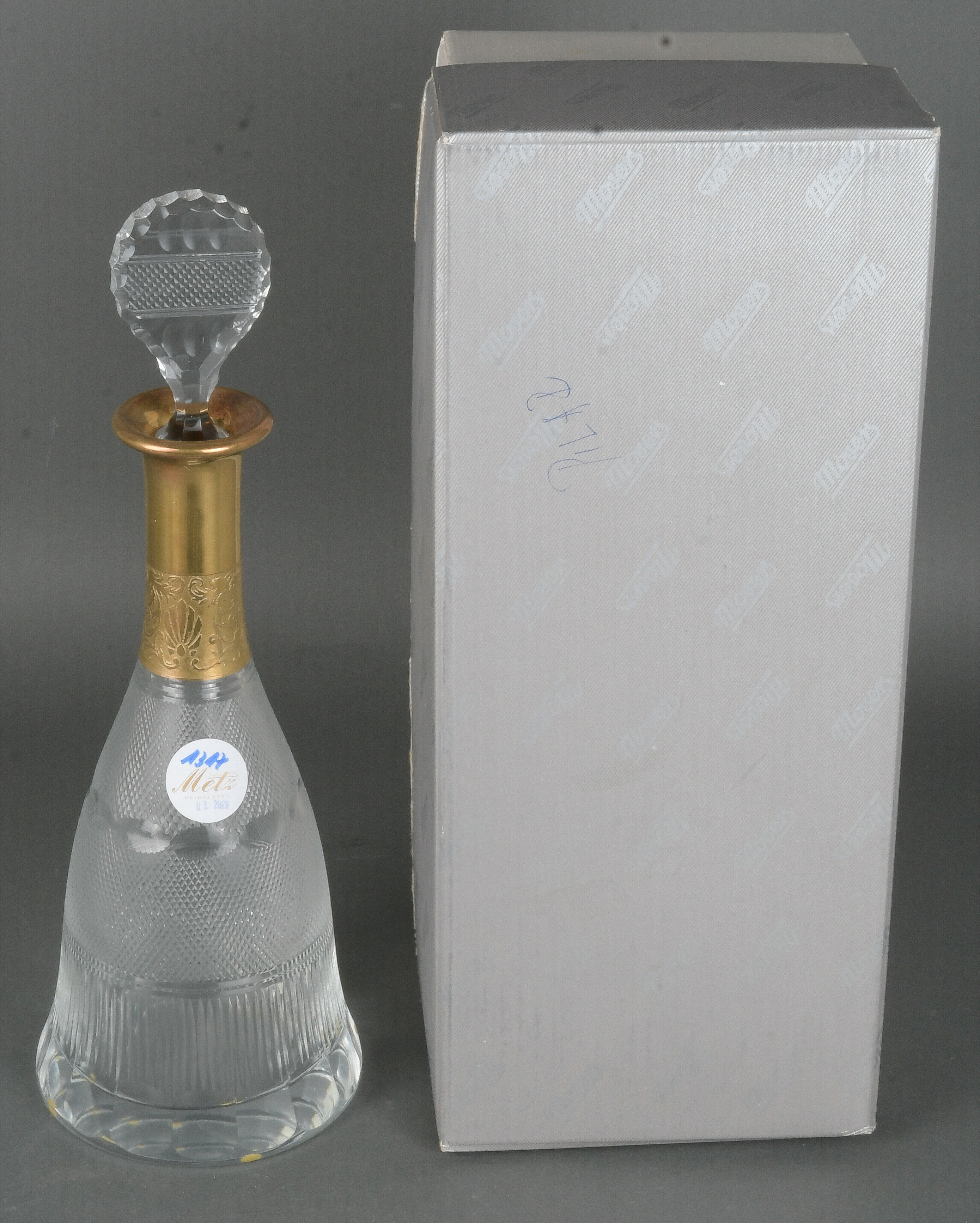 - Katalog-Nr: 1317Karaffe. Karlsbad, Moser 20. Jh. Farbloses Glas, geschliffen, mit Kaltgoldbordüre eines Palmettblattfrieses; am Boden sign., in Originalkarton, H=26 cm.o.L.