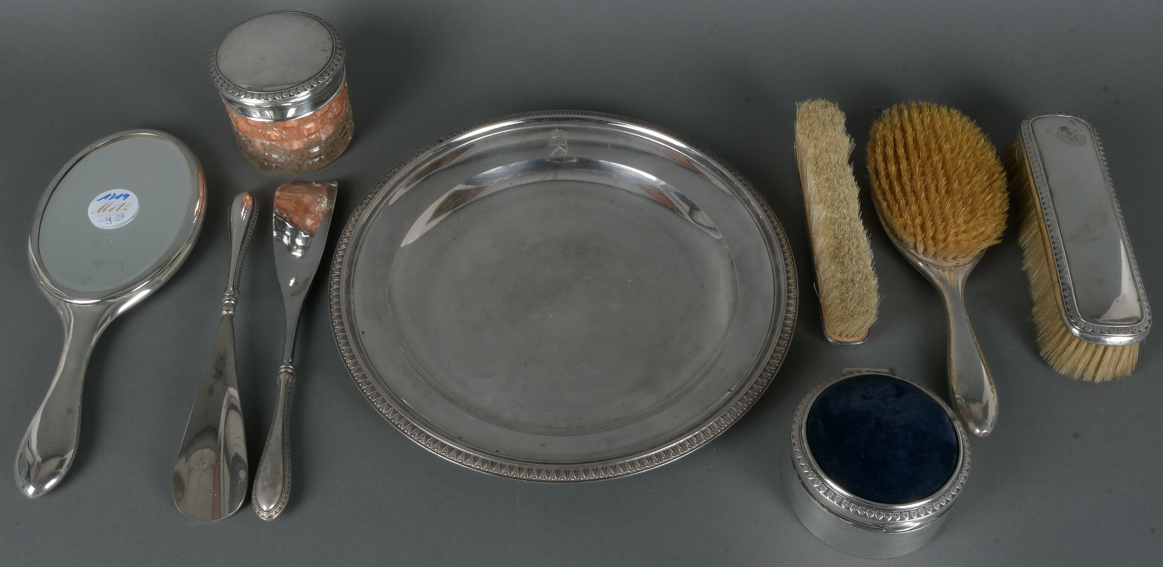 - Katalog-Nr: 1319Neuntlgs. Frisierset. Deutsch 20. Jh. 800er Silber / versilbert. Bestehend aus: Drei Bürsten, ein Handspiegel, zwei Schuhlöffel, ein rundes Tablett (D=27 cm), eine Puderdose (H=7,5 cm, D=8,5 cm) und ein Dose für Näharbeiten (H=5 cm, D=9,5 cm).o.L.