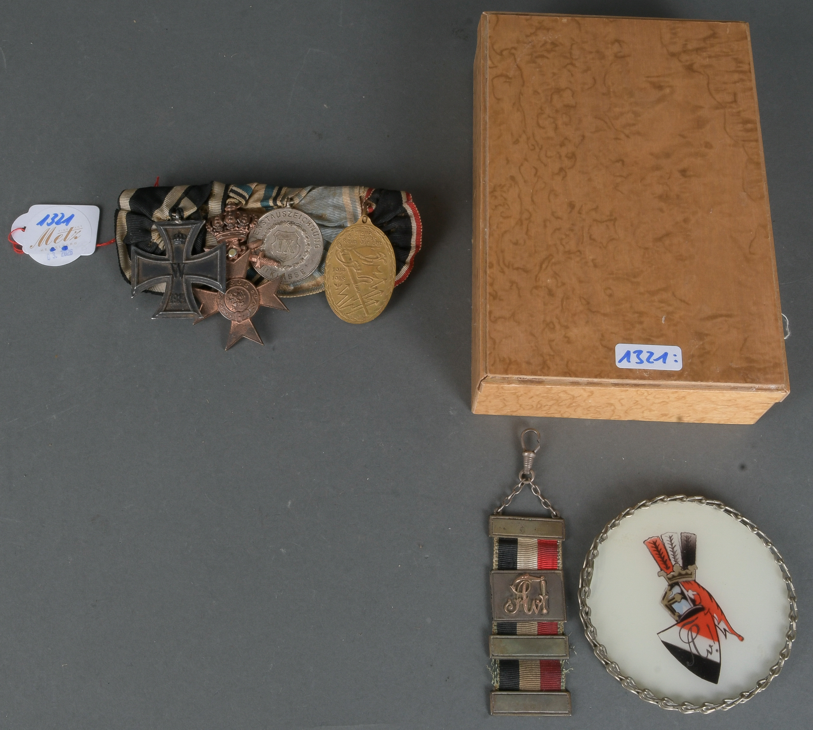 - Katalog-Nr: 1321Ordensspange des I. WK mit EK und Dienstauszeichnung III. Klasse; dazu Studentenzipfel und Plakette mit Studentenemblem.o.L.