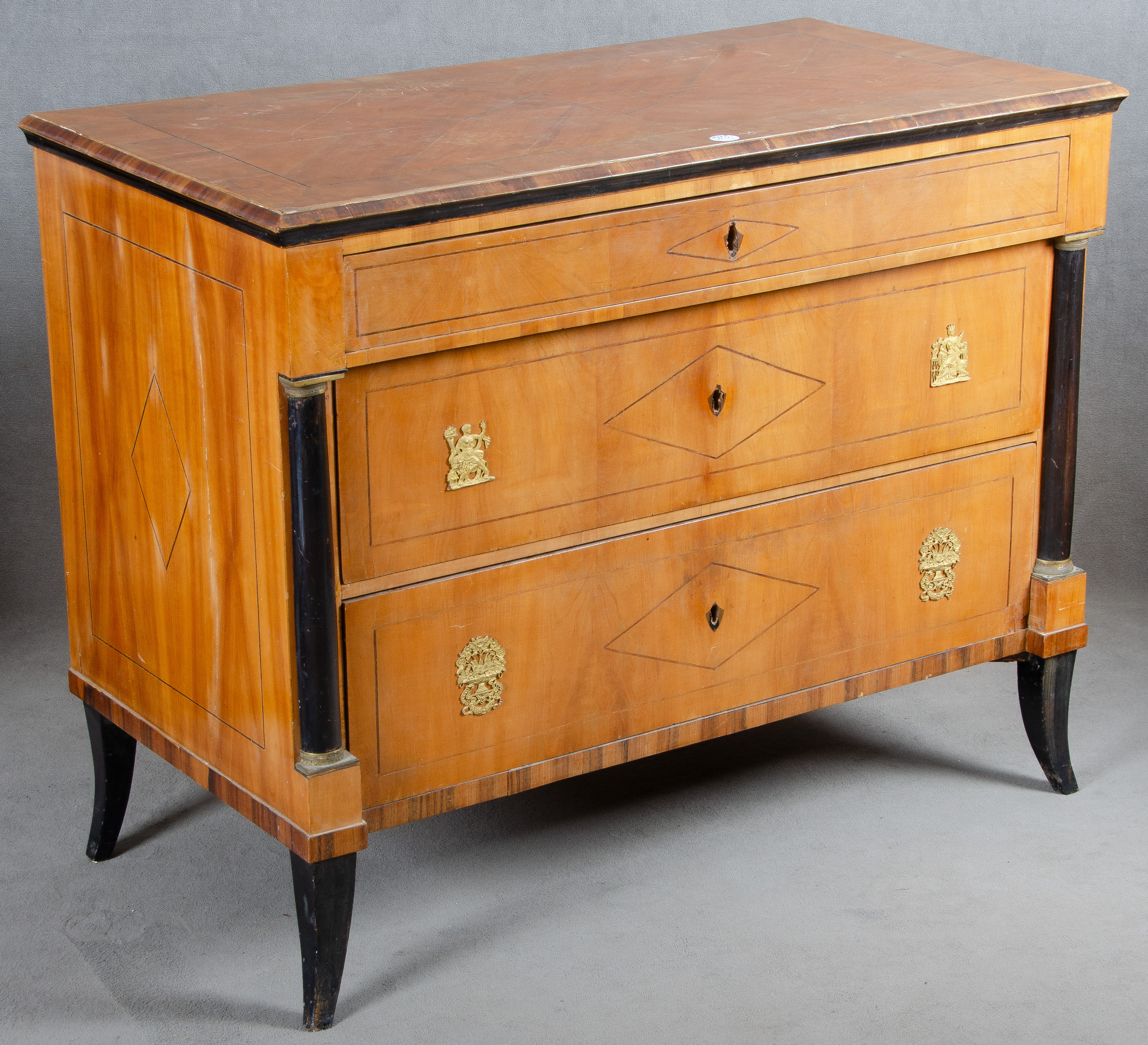 - Katalog-Nr: 1325Biedermeier-Kommode. Deutsch 19. Jh. Birn- und Kirschbaum furniert, mit Band- und Fadeneinlagen, teilw. ebonisiert; Säbelfüße, dreischübig, vorgesetzte Säulen, leicht überstehende, profilierte Platte, eingelegte Schlüsselbuchsen, H=86 cm, B=106 cm, T=56 cm. (mit Ergänzungen)o.L.