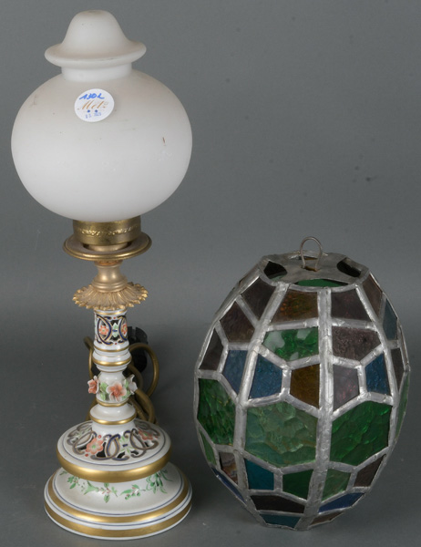 - Katalog-Nr: 1302Tischlampe. Frankreich 20. Jh. Porzellan, bunt bemalt; am Boden gemarkt; dazu bleiverglaster Lampenschirm, H=44 / 23 cm. (Funktion ungeprüft)o.L.