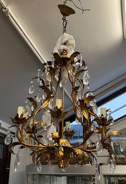 - Katalog-Nr: 1305Sechsflammiger Deckenlüster. Deutsch 20. Jh. Metall mit Prismenbehang, H=70 cm, D=56 cm. (Funktion ungeprüft)o.L.