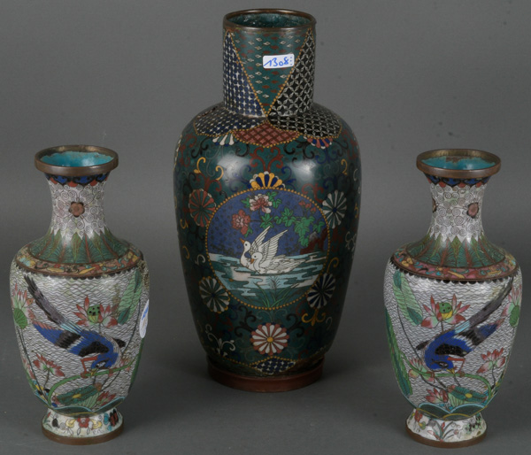 - Katalog-Nr: 1308Paar Cloisonnévasen. Asien. Je bunt emailliert mit Schwanenmotiv und Floraldekor; dazu eine weitere, H=22 / 30,5 cm. (besch.)o.L.