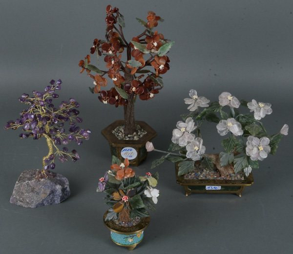 - Katalog-Nr: 1310Vier Feng Shui-Bäume. Asien. Je besetzt mit Halbedelsteinen als Blattwerk, einer in Cloisonnétopf, H=15 bis 30,5 cm.o.L.