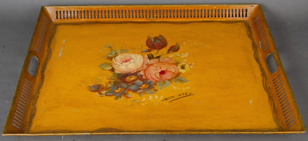 - Katalog-Nr: 1313Serviertablett. Italien um 1900. Blech, senffarben lackiert und bunt floral bemalt, re./u. unleserlich sign., H=3,3 cm, B=50,5 cm, T=40 cm.o.L.