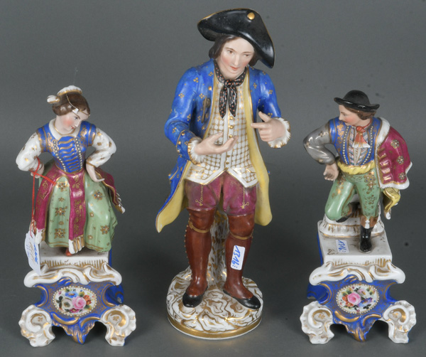 - Katalog-Nr: 1316Drei Figuren in ländlicher Tracht. Paris, Jacob Petit 19. Jh. Porzellan, bunt bemalt und gold staffiert; eine am Boden mit unterglasurblauem „JP“, H=24 bis 31 cm.o.L.