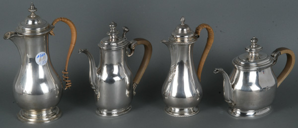 - Katalog-Nr: 1320Vier unterschiedliche Kannen. England 20. Jh. Silber, ca. 2.461 g, mit Holz- bzw. bastumwickeltem Henkel; am Boden teilw. gemarkt „Jays“, je mit ziseliertem bekröntem Monogramm „J“, H=17,5 bis 26,5 cm.o.L.