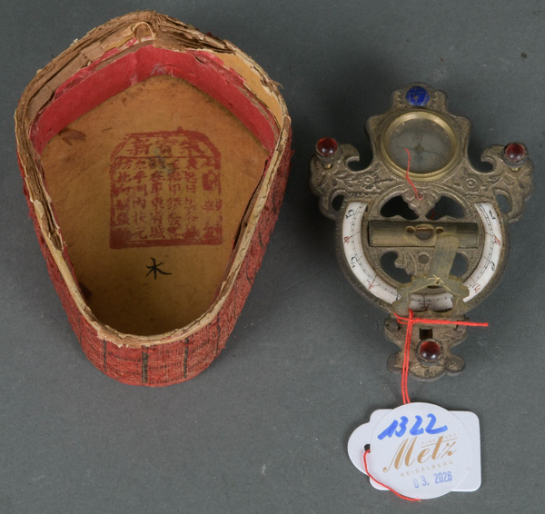 - Katalog-Nr: 1322Tischkompass. Asien. Metall, teilw. emailliert, H=7,5 cm, B=10,5 cm, T=7 cm. (Funktion ungeprüft)o.L.