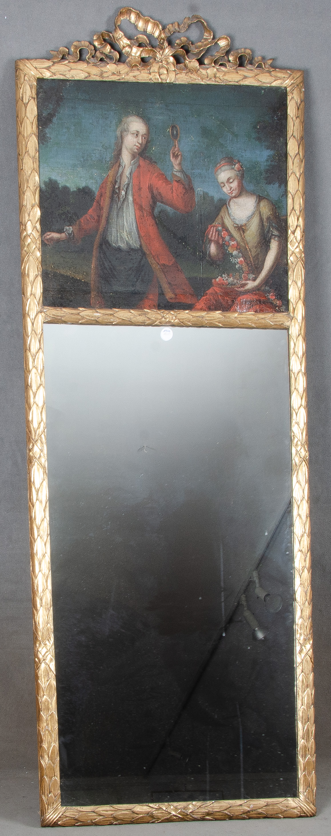 - Katalog-Nr: 1326Trumeau-Spiegel. Frankreich 18. Jh. Massivholz, auf Kreidegrund gold gefasst, dekoriert mit Blättern und Schleifen, im Trumeaufeld bunt bemalt mit figürlicher Szene eines Jünglings mit Spiegel und Dame mit Blumen, 203 x 73 cm. (rest.)o.L.