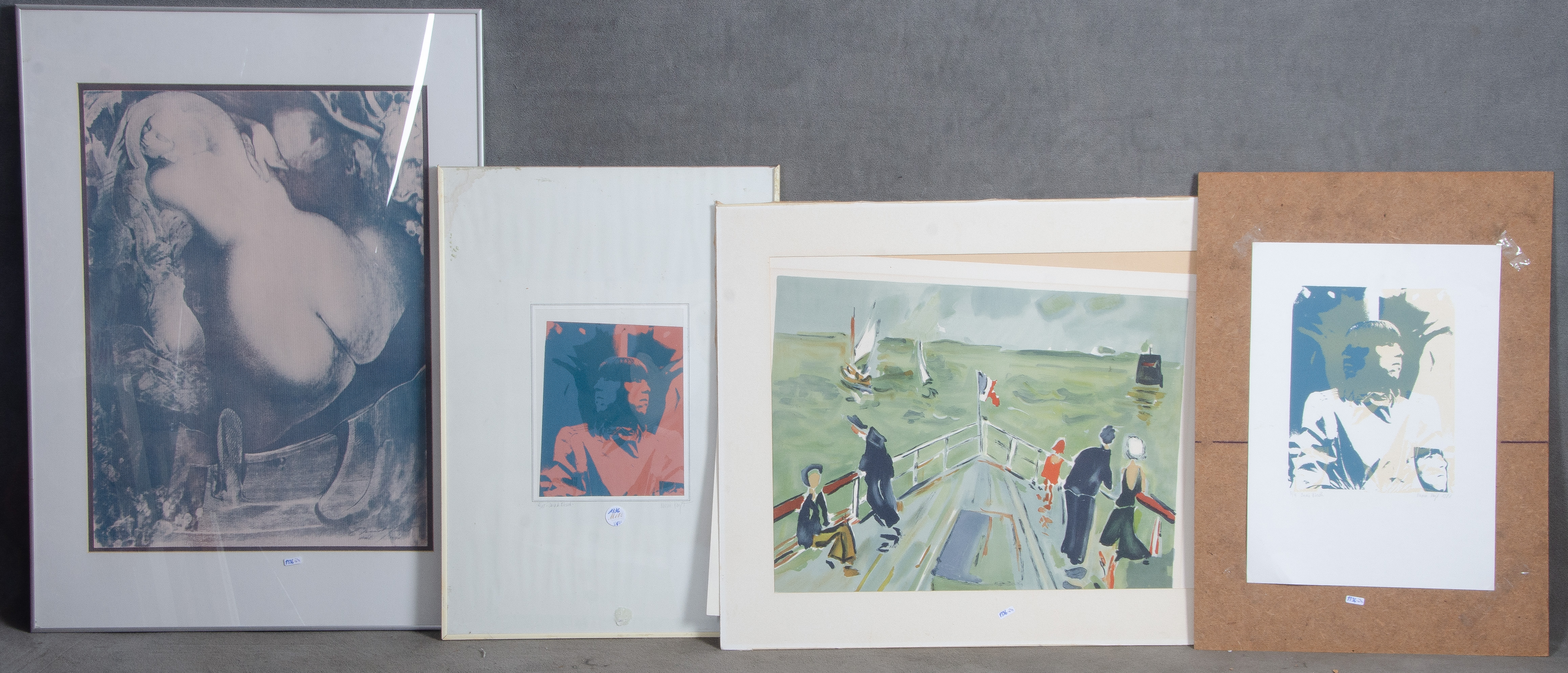 - Katalog-Nr: 1336Graphiker des 20. Jhs. Vier Farblithographien mit Porträts, Aktdarstellung und Schifffahrtsszene, teilw. unleserlich sign./num., teilw. mit Passepartout, teilw. hi./Gl. gerahmt. (teilw. besch.)o.L.