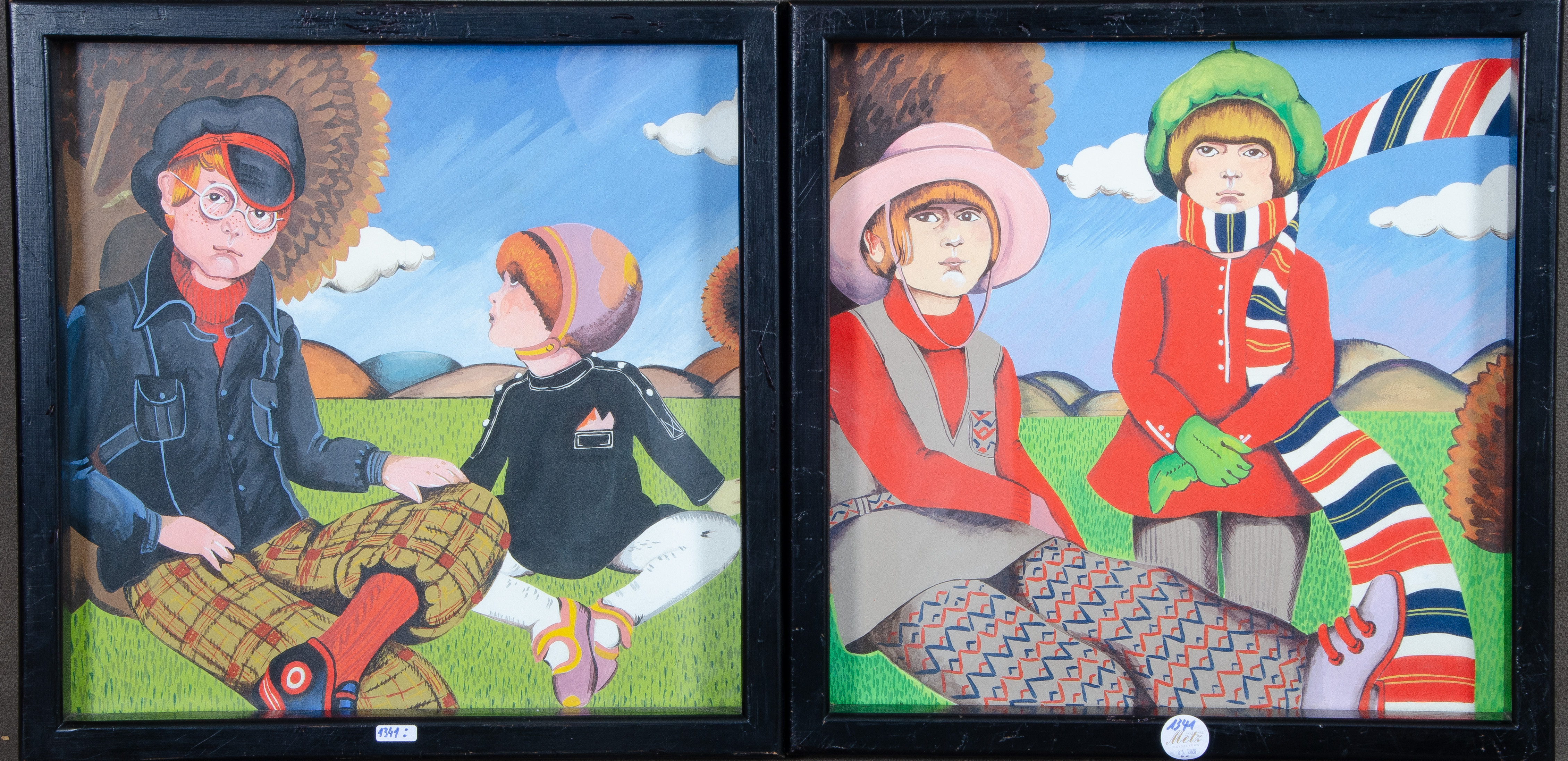 - Katalog-Nr: 1341Graphiker des 20. Jhs. Landschaften mit Kindern. Zwei Farblithographien, hi./Gl. gerahmt, 42,5 x 42,5 cm.o.L.