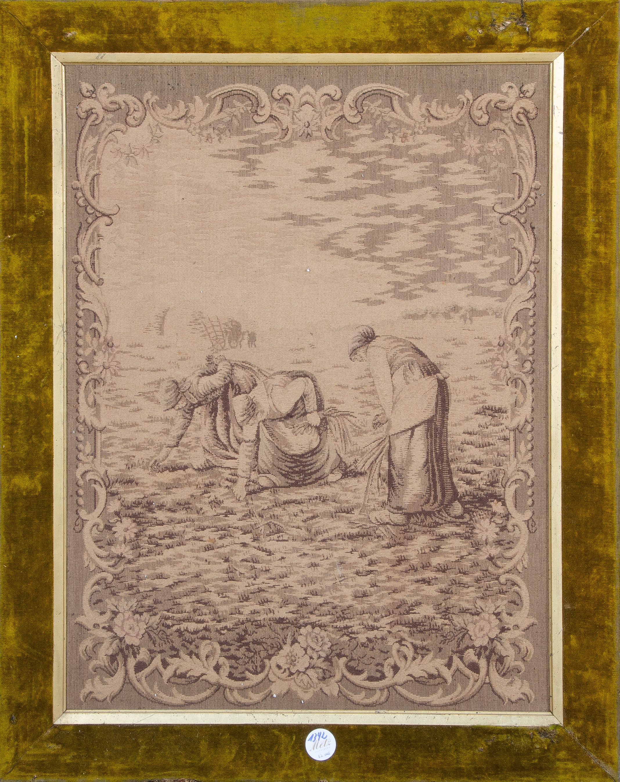 - Katalog-Nr: 1342Gobelin mit Ernteszene um 1900, in profiliertem Rahmen, 66 x 50 cm.o.L.