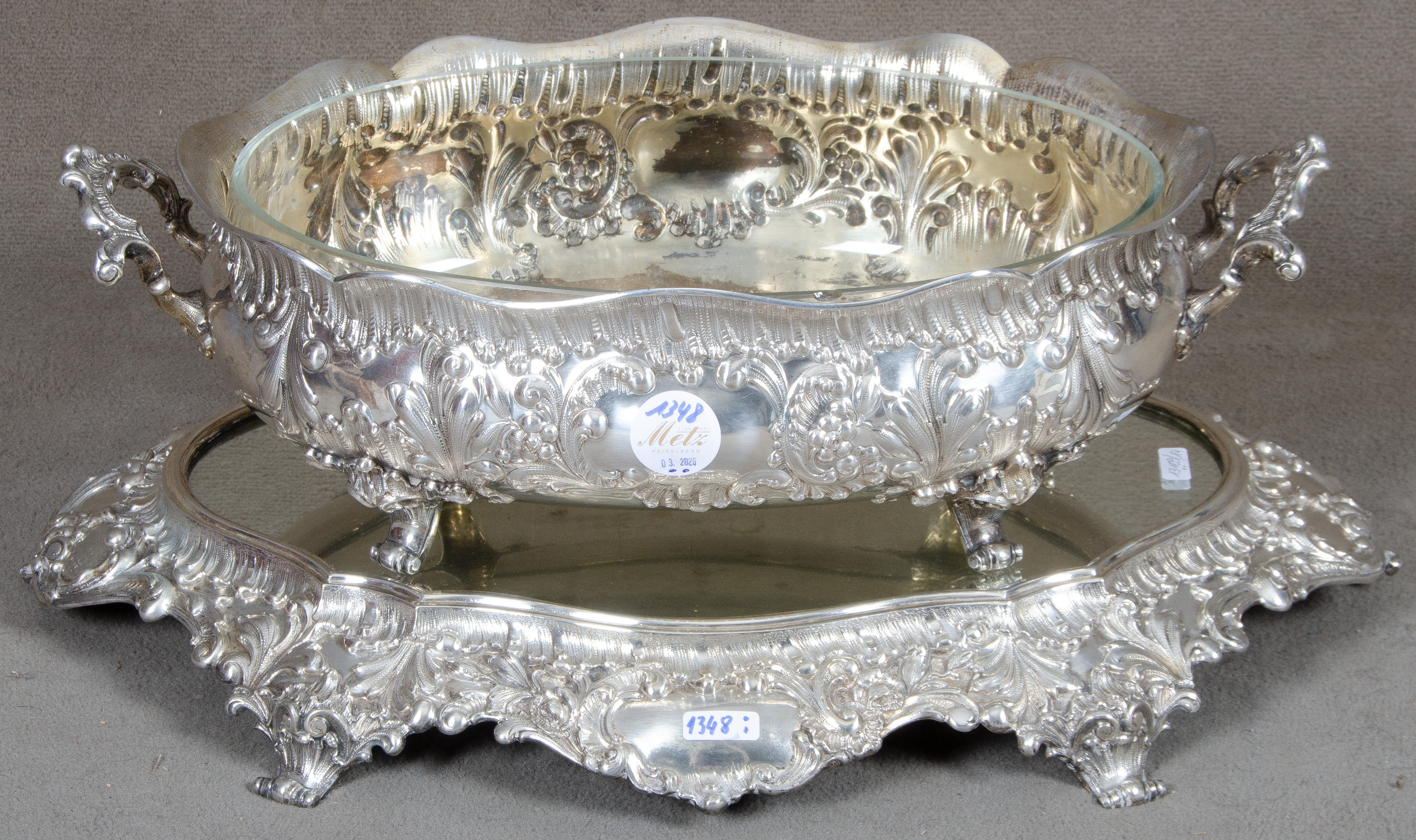 - Katalog-Nr: 1348Ovale Henkelschale mit verspiegelter Unterschale. Deutsch 20. Jh. Silber, ca. 1.138 g, mit rocailleziselierter Wandung, H=12 cm, B=44 cm, T=25 cm / H=5,5 cm, B=50 cm, T=35 cm.o.L.