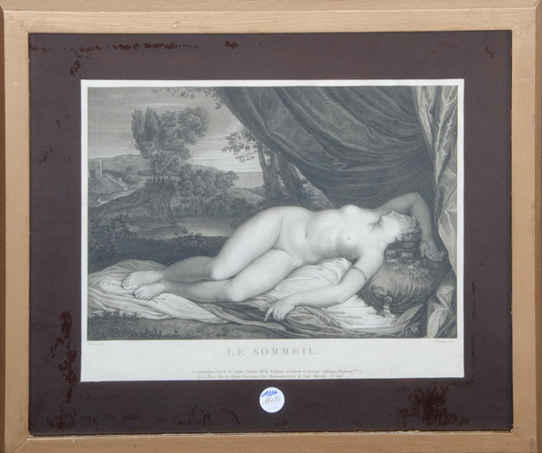 - Katalog-Nr: 1337Antoine Louis Romanet (1742-c. 1815). Schlummernde Venus. Kupferstich, re./u./sign., mit Passepartout hi./Gl. gerahmt, 31 x 45 cm.o.L.