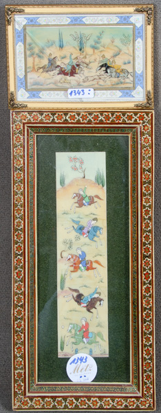 - Katalog-Nr: 1343Persischer Miniaturist des 20. Jhs. Zwei Reiterszenen, hi./Gl. gerahmt, 6,5 x 11 / 20,5 x 5 cm. (ein Glas besch.)o.L.