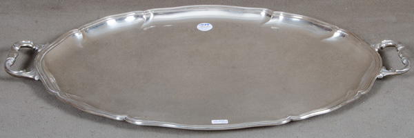 - Katalog-Nr: 1349Serviertablett mit Henkeln. Silber, ca. 2.682 g, H=3 cm, B=69 cm, T=43,5 cm.o.L.
