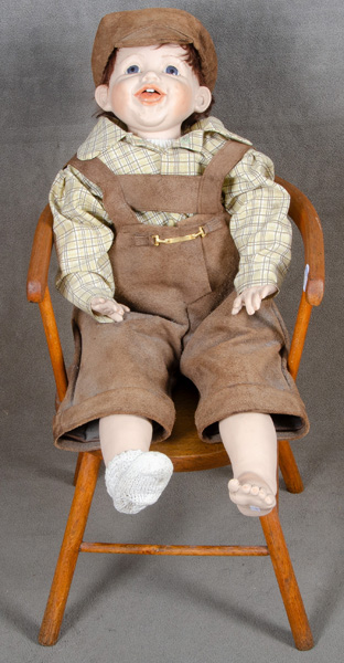 - Katalog-Nr: 1350Puppenjunge in Stuhl. Fayzah Spanos 20. Jh. Porzellan, H=65 cm.o.L.
