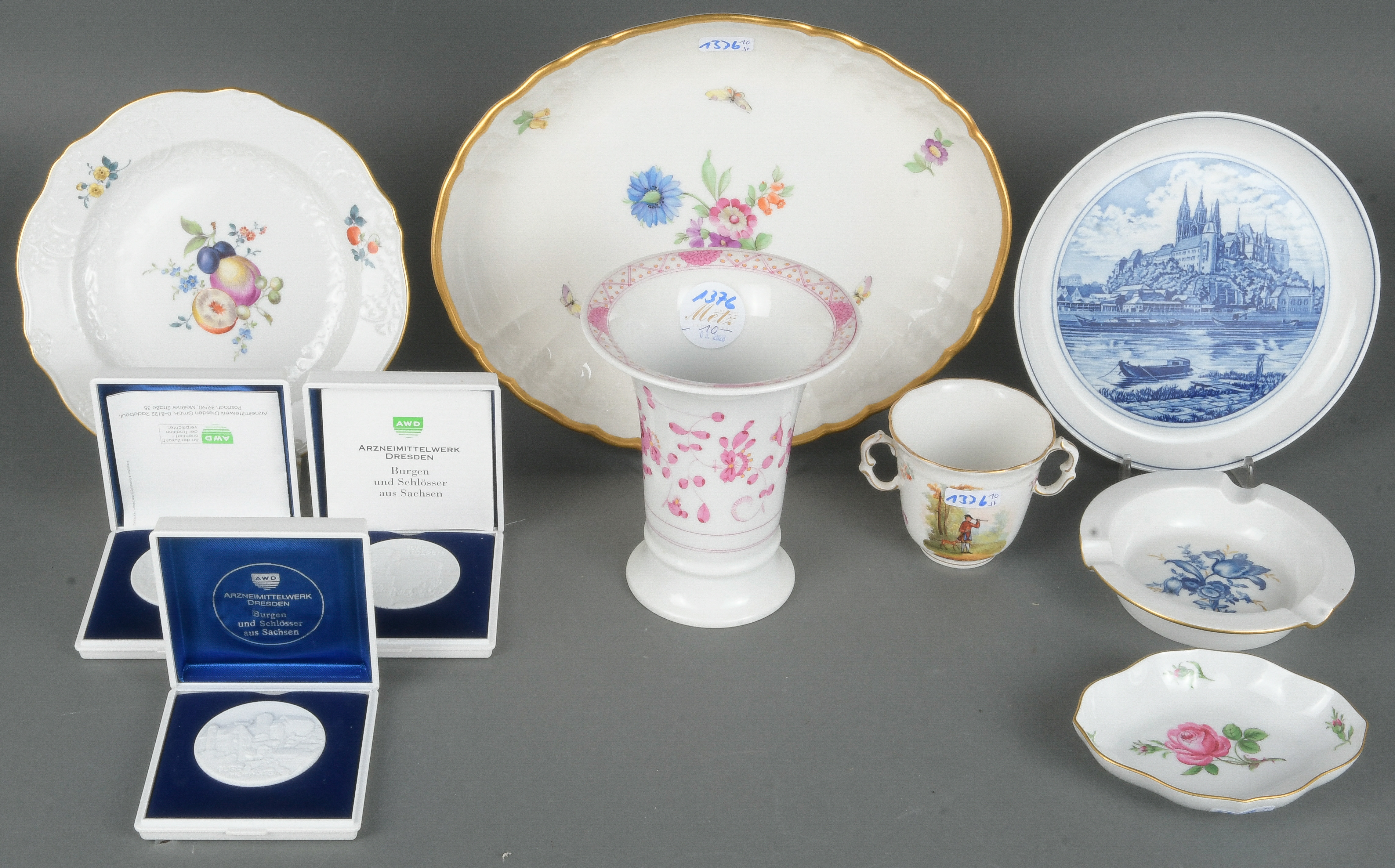 - Katalog-Nr: 1376Zehntlgs. Konvolut, u.a. Berlin / Meissen 20. Jh. Porzellan, meist bunt bemalt; am Boden gemarkt. Bestehend aus: Ein Aschenbecher (D=12,5 cm), drei Jubiläumsmedaillen (D=5 cm), eine Löffelschale (B=12 cm), eine ovale Schale (H=4 cm, B=27,5 cm, T=22 cm), eine Tasse, zwei Teller (D=18 cm) und eine Vase (H=14 cm).o.L.