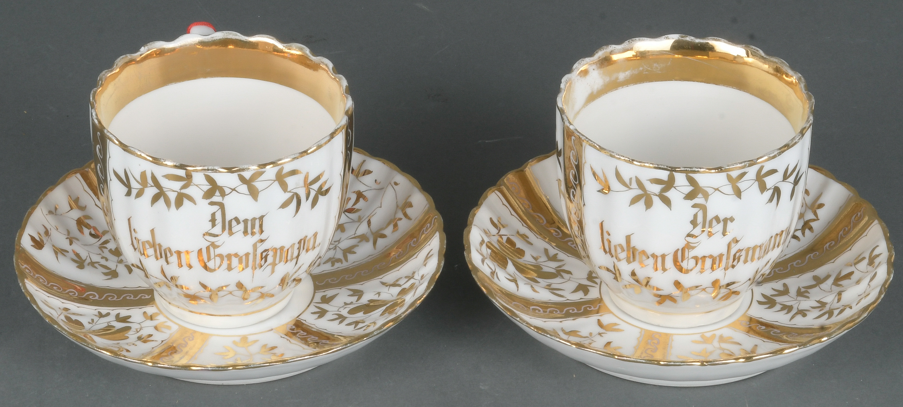 - Katalog-Nr: 1384Zwei Tassen mit Unterschalen. Altwasser, Carl Tielsch 1845-1914. Porzellan, reich gold dekoriert und beschriftet: „Dem lieben Großpapa“ und „Der lieben Großmama“; am Boden unterglasurblaue Stempelmarke.o.L.