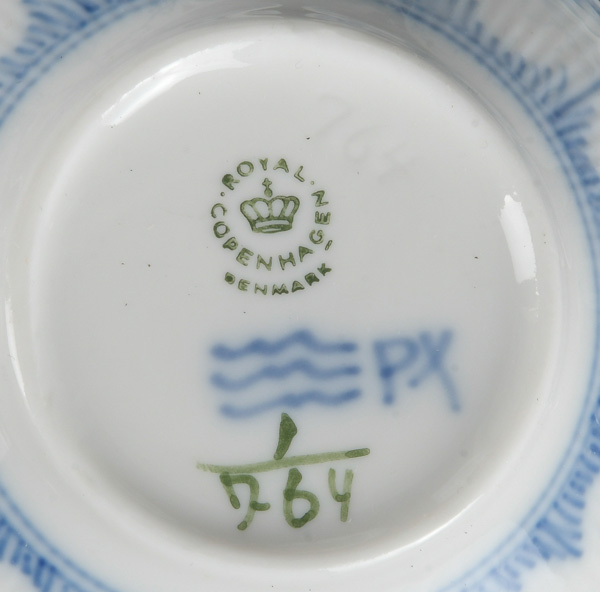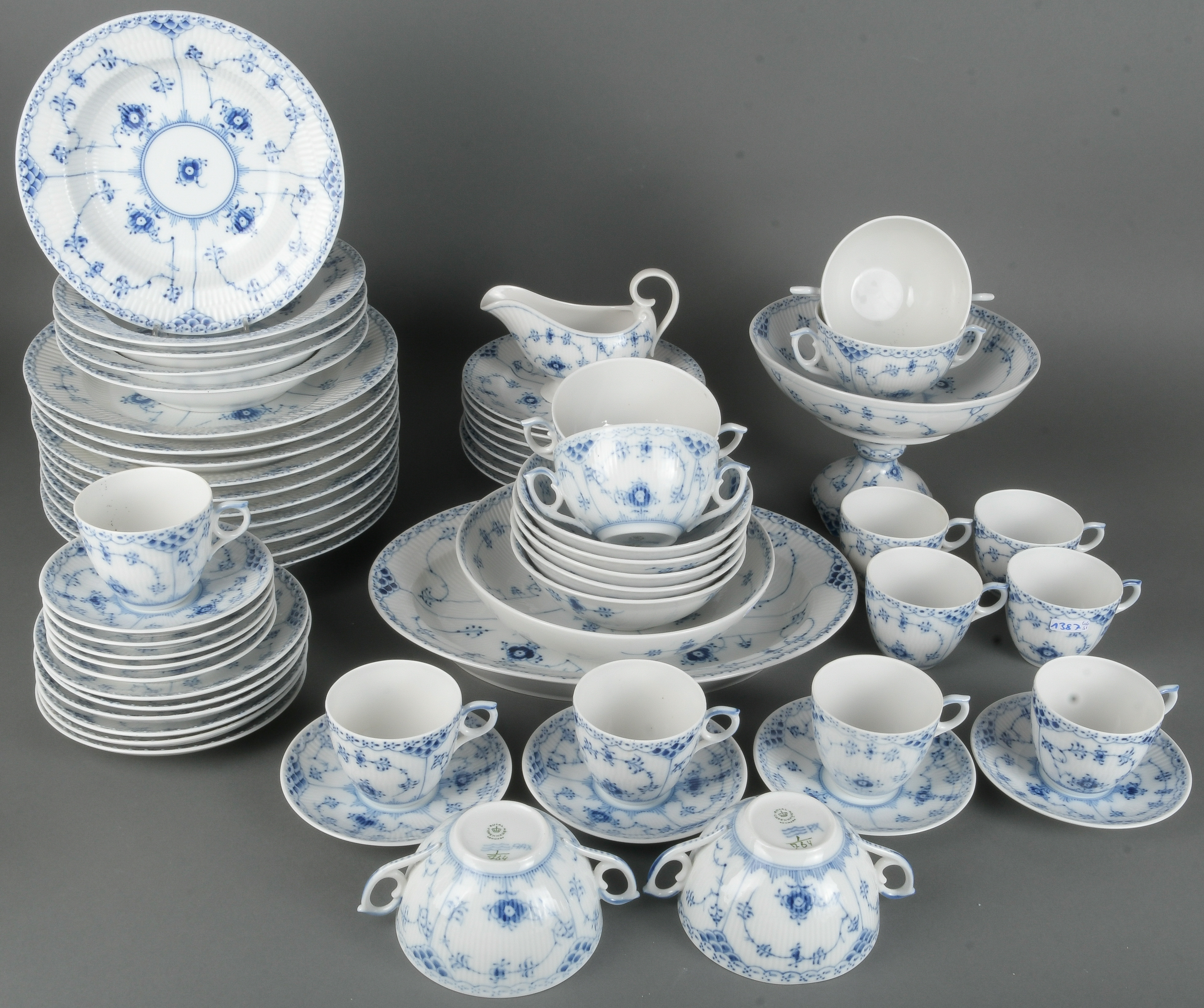 - Katalog-Nr: 138746-tlgs. Service „Strohblume“. Royal Copenhagen 20. Jh. Porzellan, unterglasurblau bemalt; am Boden gemarkt. Bestehend aus: Neun Tassen mit Unterschalen, sechs Doppelhenkeltassen mit Unterschalen, zehn Speiseteller (D=je 25,5 cm), fünf Suppenteller (D=je 21 cm) sieben Beilageteller (D=je 19 cm), fünf Schalen (H=je 5 cm, D=je 15,5 cm), eine Schale (H=5,5 cm, D=21 cm), eine ovale Platte (H=4,5 cm, B=33 cm, T=25 cm), eine Saucière (H=10,5 cm), ein Tafelaufsatz (H=15 cm).o.L.