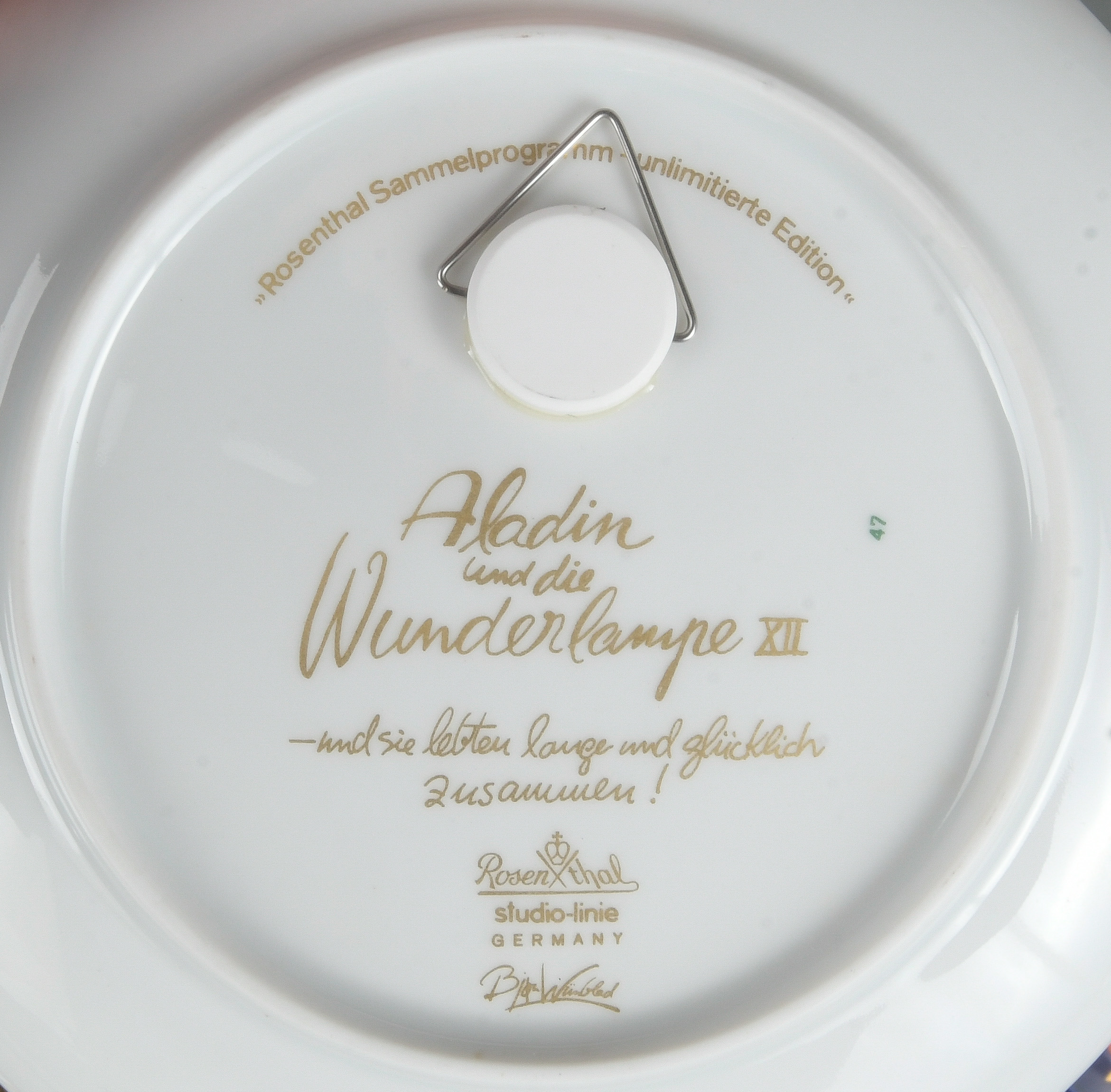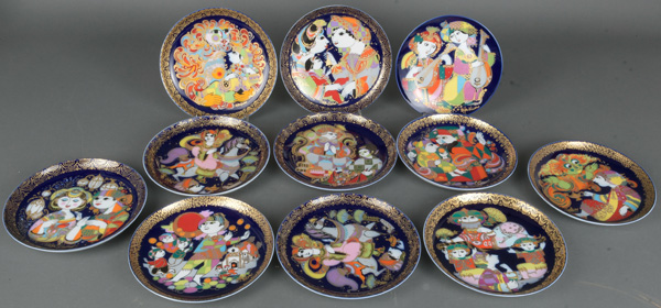 - Katalog-Nr: 1389Elf Wandteller. Rosenthal 20. Jh. Porzellan, bunt bemalt und gold überdekoriert mit Motiven aus „Aladin und die Wunderlampe“ (zehn Stück) und „Orientalische Nachtmusik“ (ein Stück), Entwurf und sign. Björn Wiinblad, D=15,5 / 16 cm.o.L.