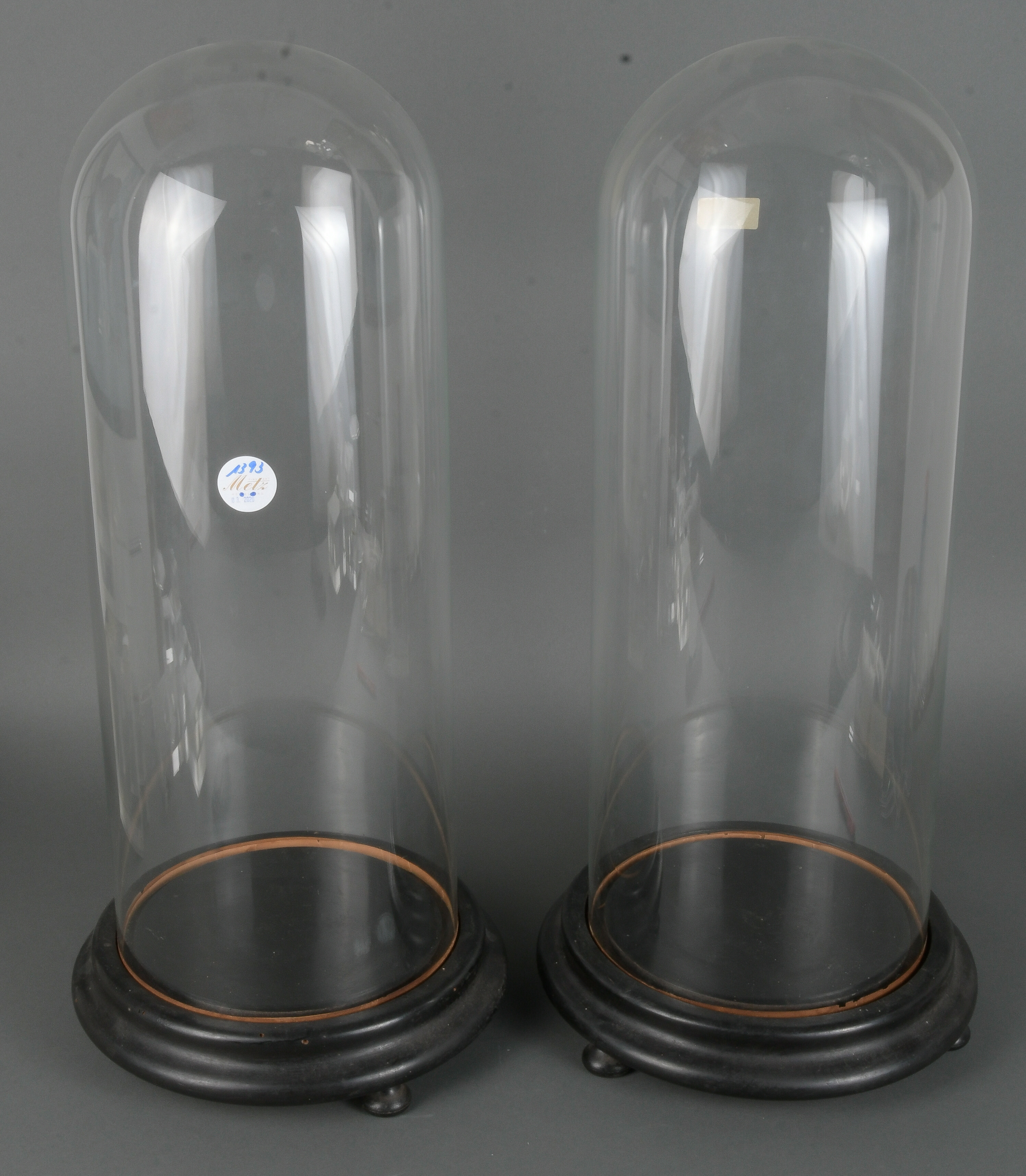 - Katalog-Nr: 1393Paar hohe Glasstürze auf gedrechselten Massivholzsockeln mit Kugelfüßen, H=53,5 cm, D=21 cm / H=6 cm, D=26,5 cm.o.L.