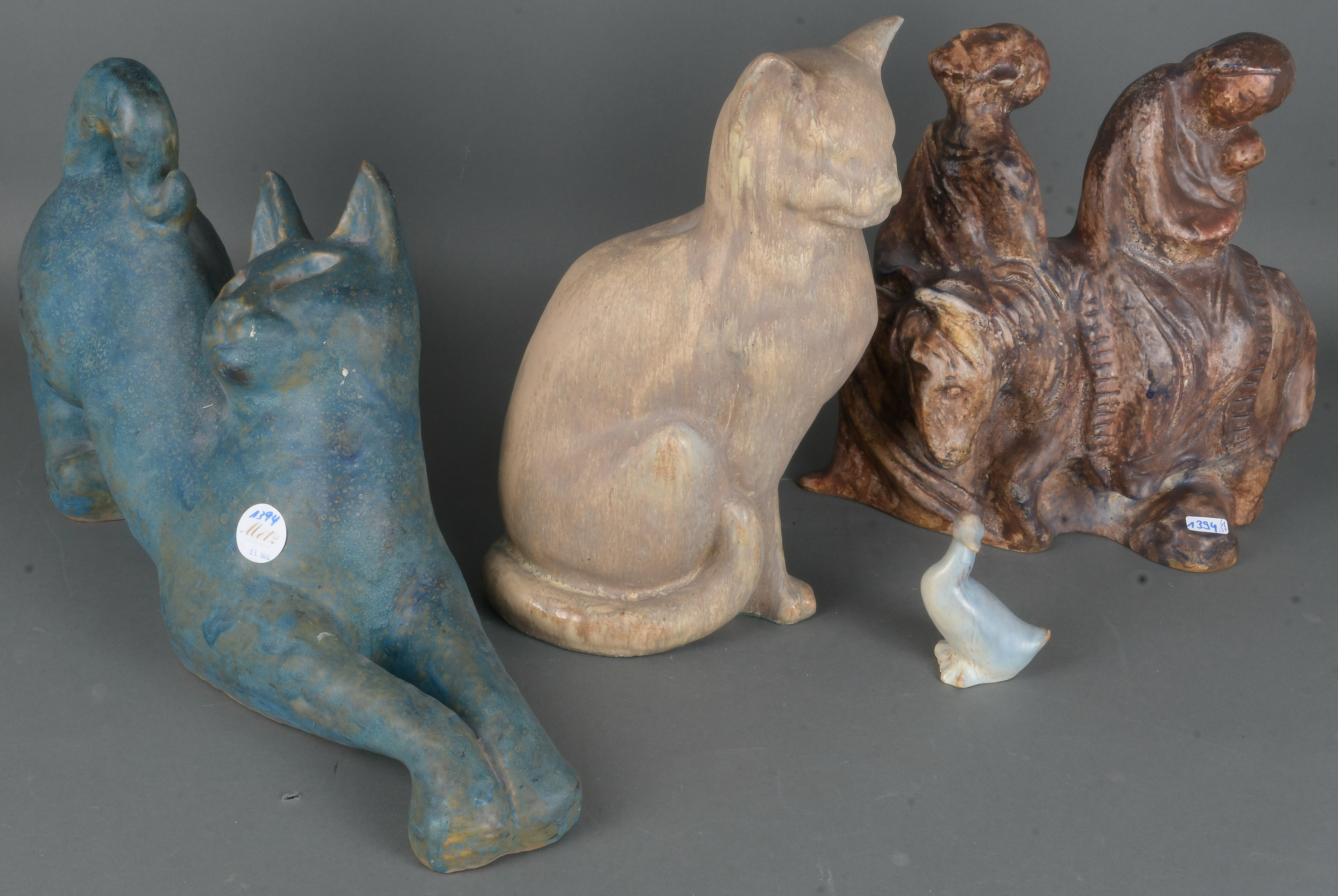 - Katalog-Nr: 1394Georg Günther Zeuner (1923-2011). „Flucht nach Ägypten“. Keramikskulptur, bunt glasiert, verso sign. (H=31 cm); dazu eine Keramik-Ente und zwei -Katzen, eine monogr. „HR“, H=10,2 bis 34 cm.o.L.
