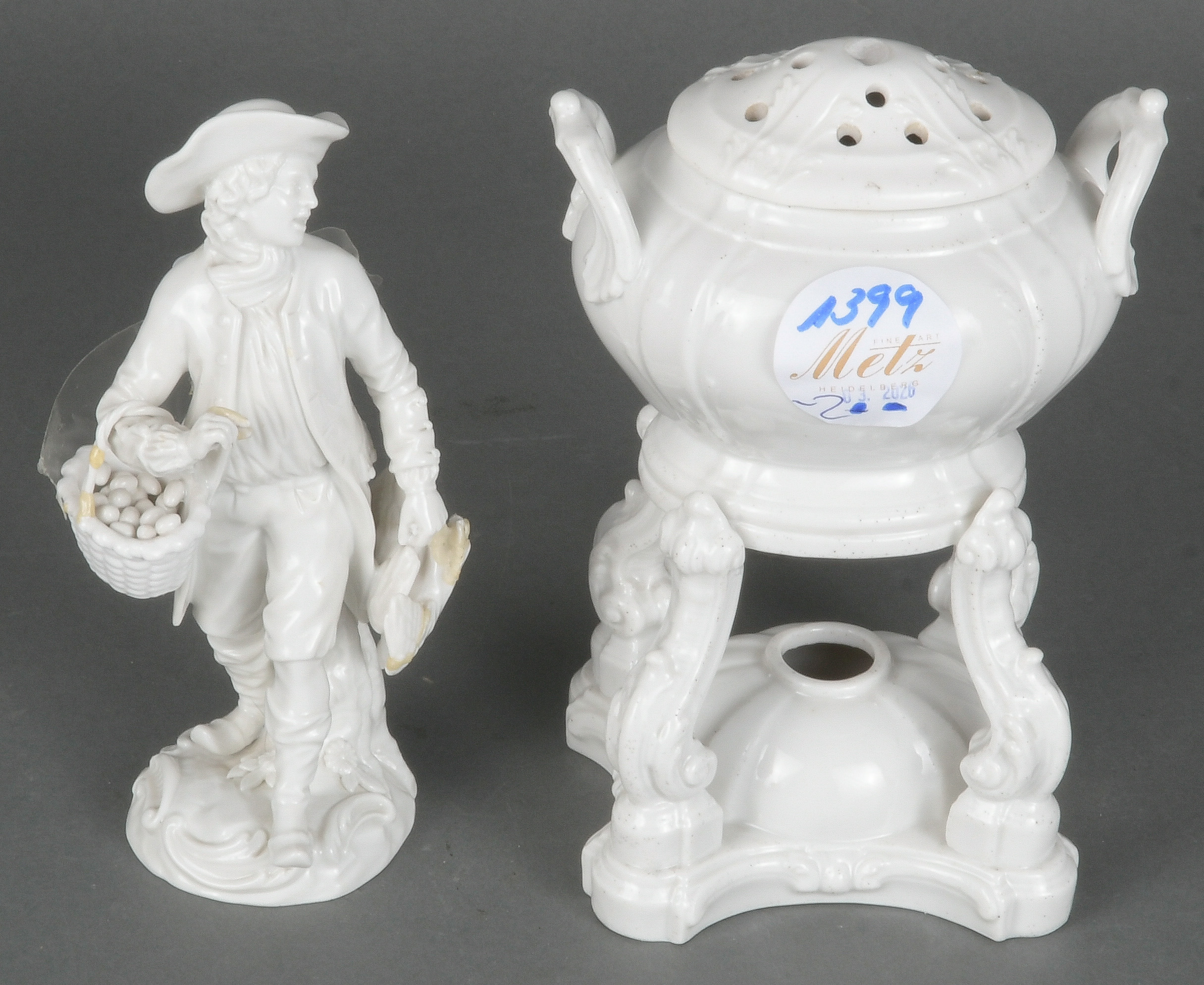 - Katalog-Nr: 1399Geflügelverkäufer und Potpourrigefäß. Meissen / Berlin 20. Jh. Porzellan, weiß glasiert; am Boden unterglasurblaue Schwertermarke mit drei Schleifstrichen / Szeptermarke, H=14 cm. (besch.)o.L.