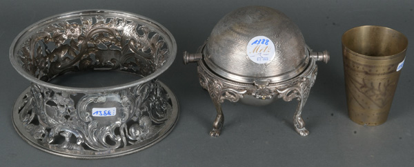 - Katalog-Nr: 1388Zweitlgs. Konvolut Versilbertes: Kaviarschale (H=13 cm, D=14 cm) und floral durchbrochener Sockel (H=8,5 cm, D=18 cm); dazu Messing-Becher.o.L.