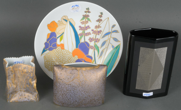 - Katalog-Nr: 1392Eine Designer-Schale und drei -Vasen. Rosenthal 20. Jh. Porzellan, am Boden gemarkt. Bestehend aus: Eine Schale, sign. W. Bauer (H=4 cm, D=22 cm) und drei Vasen, zwei sign. H. Dressler (H=10 bis 17,5 cm).o.L.